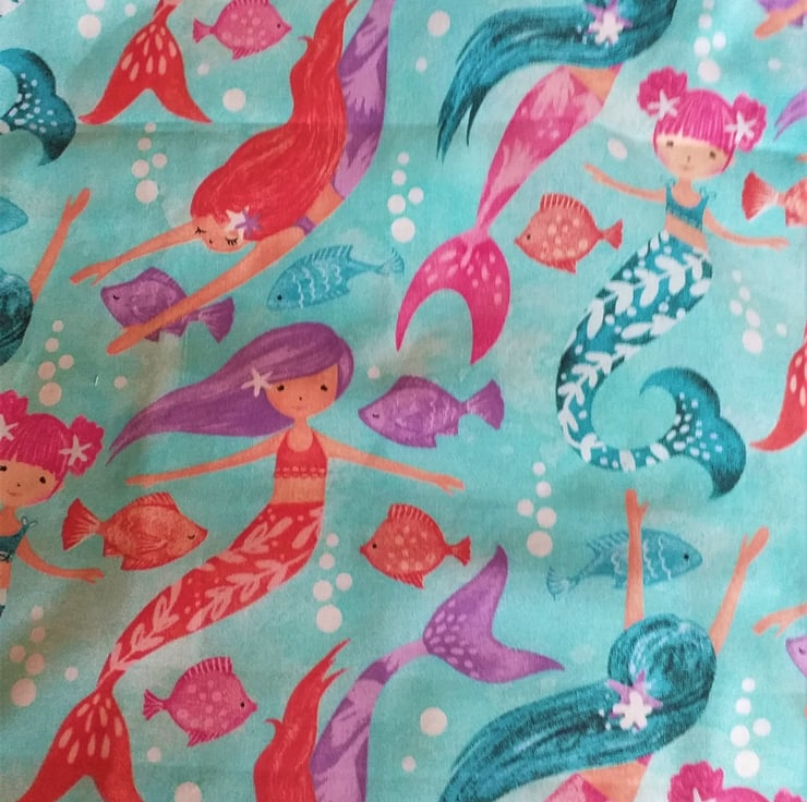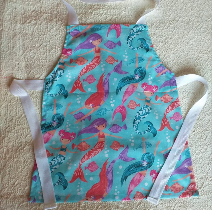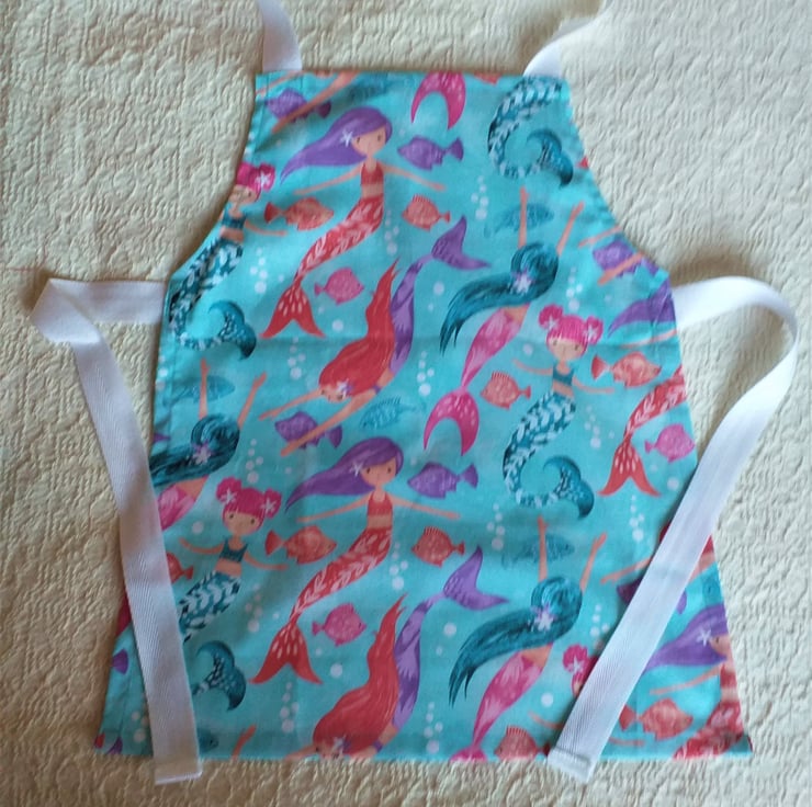 How lovely are these mermaids, happily swimming with the fish in a pale turquoise sea! (They may not appear in the same positions as in the photographs.) I have made these pinnies of good quality cotton, with white acrylic straps. They are 17" (43 cm.) long and 15" (38 cm.) at the hem and fit a child from two to six approximately. They are fully machine washable.