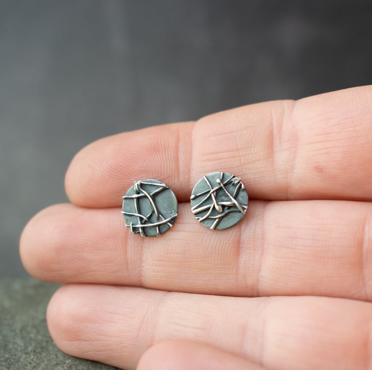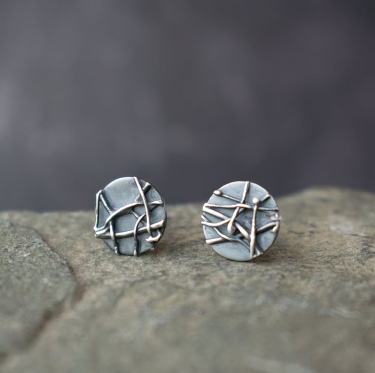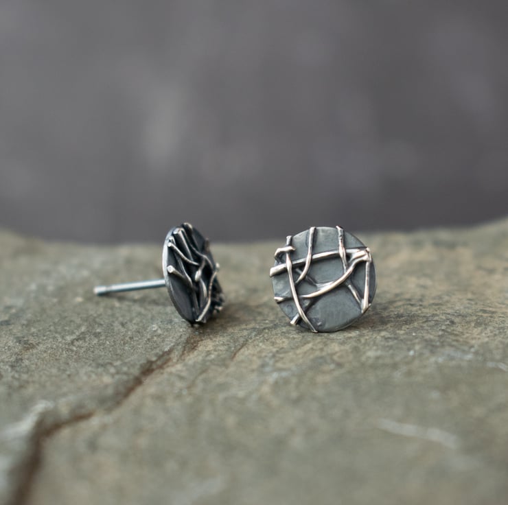 These unique earrings feature a 'doodle' art design crafted in sterling silver. Created using off-cuts of wire, the abstract design stands out against the darkened silver background to stunning effect. Each piece will be completely unique, formed as the silver melts together just enough to retain the individuals strands. As such, please expect variance from those in the photo.