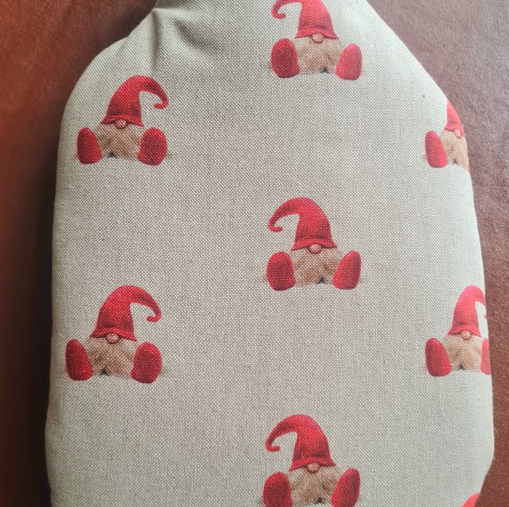 This is a handmade hot water bottle cover (comes with a 2 litre hot water bottle ) made in Christmas Gonk fabric .