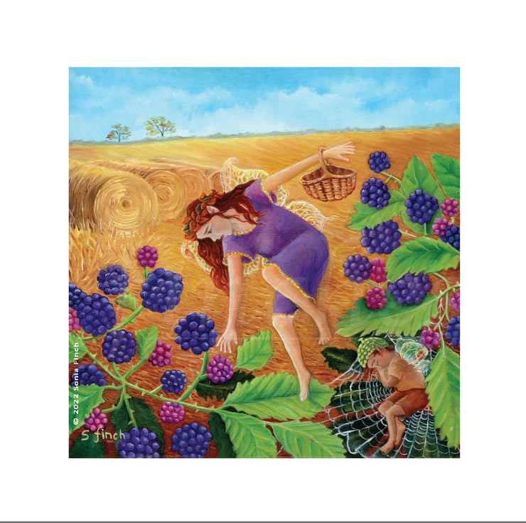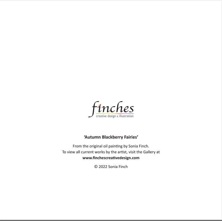 A beautiful blank greeting card created from the oil painting 'Autumn Blackberry Fairies' by Sonia Finch. Perfect for any fairy or woodland wildlife lovers who love the Autumn.