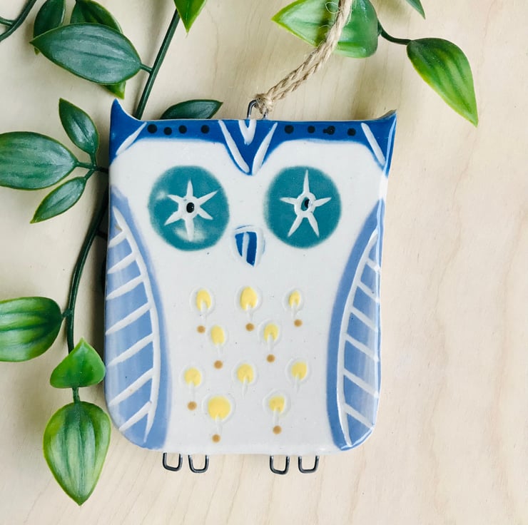 Made from stoneware and glazed using the sgraffito technique, where you build up layers of coloured slip to then carve your pattern into. This beautiful little Owl is a fabulous unique gift as no two will ever be the same. Perfect for brightening up your house or garden. Frost proof you can hang it anywhere inside or out. This owl is marked as a second as it isn’t flat and has a slight bend which prevents it flat laying totally flat.