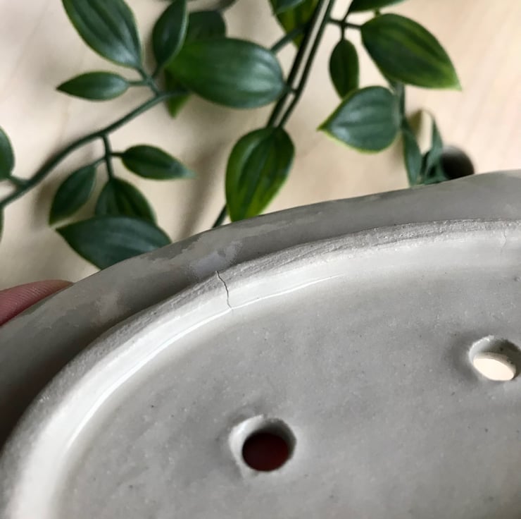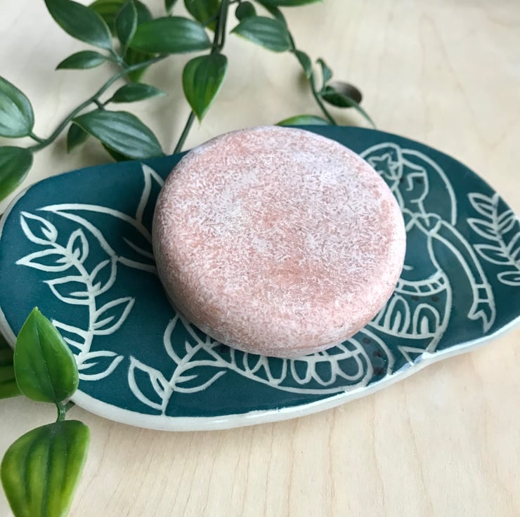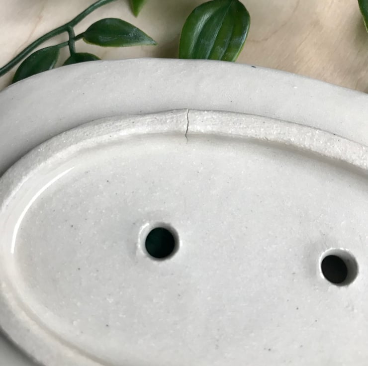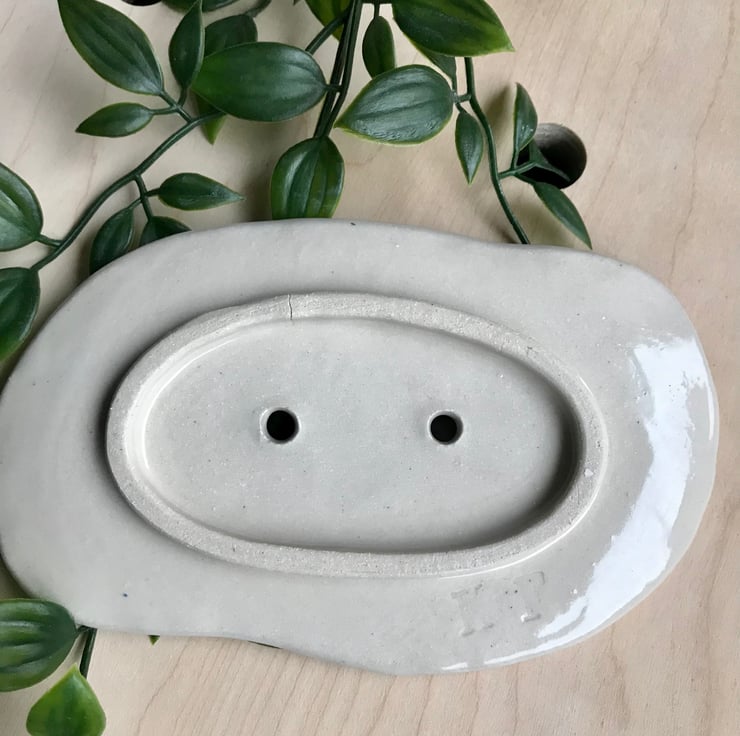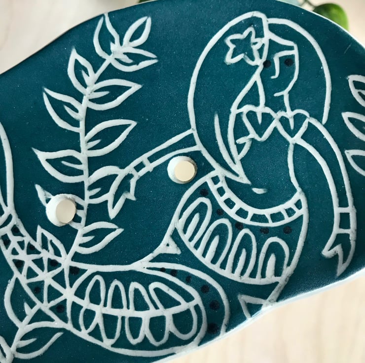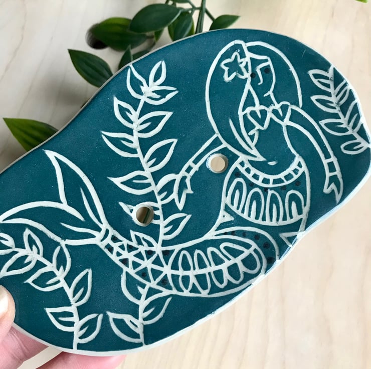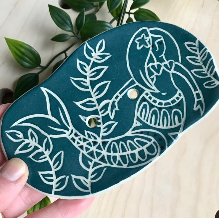 Handmade stoneware soap dish, measuring approximately 14cm in length and 7.5cm in width. Slightly dish shaped with foot ring and a drainage hole. Decorated using the sgraffito technique, where the design is carved into layers of coloured slip. I then finish with small dots of contrasting colours. Each is unique thanks to the hand carving technique. Dishwasher and frost proof, made for everyday use. This dish is marked as a second because of a small crack in the foot ring on the base. It is still perfectly useable.