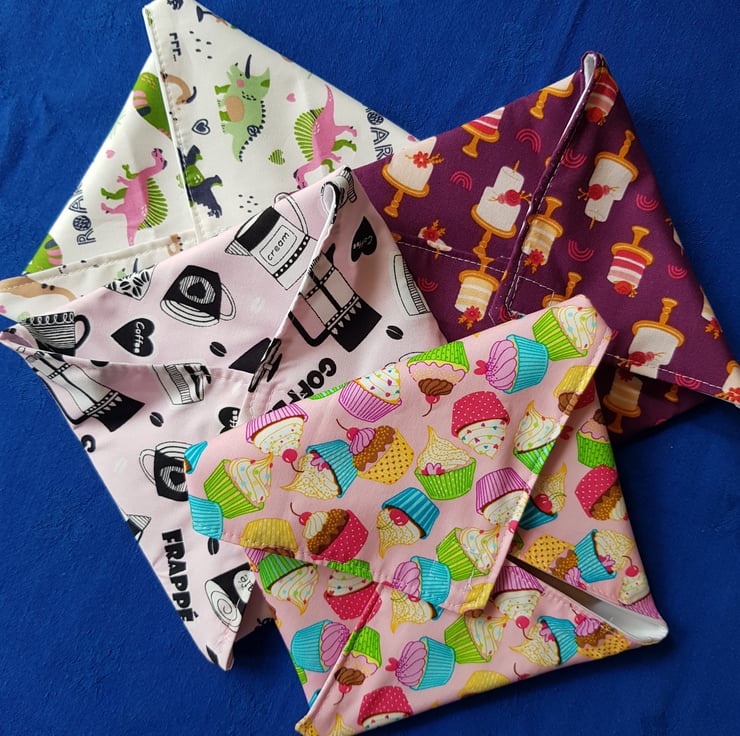 These reuseable sandwich wrappers are eco friendly. The outer fabric is cotton and they are lined with antimicrobial woven polyester containing no harmful chemicals.