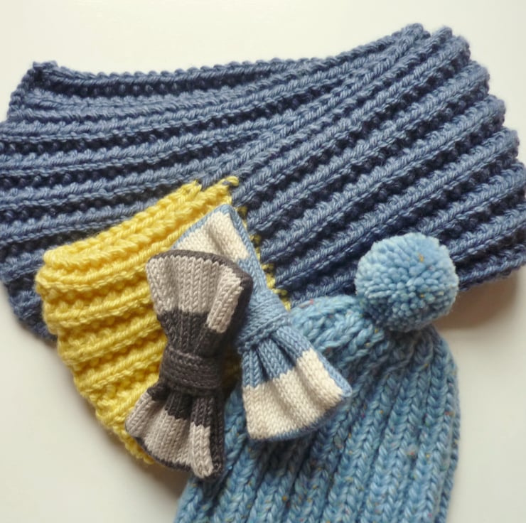Dress up a young man with this hand knitted set....scarf, hat, bows...sorted!!