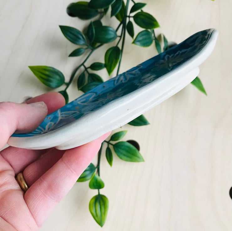 Handmade stoneware dish, measuring approximately 15cm. Slightly dish shaped with foot ring. Decorated using the sgraffito technique, where the design is carved into layers of coloured slip. I then finish with small dots of contrasting colours. Each is unique thanks to the hand carving technique. Dishwasher and frost proof, made for everyday use.