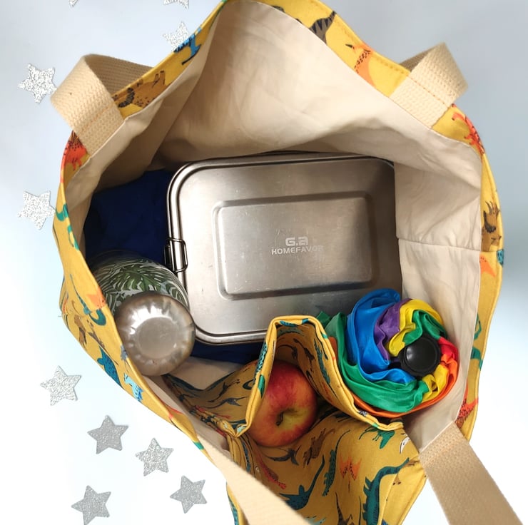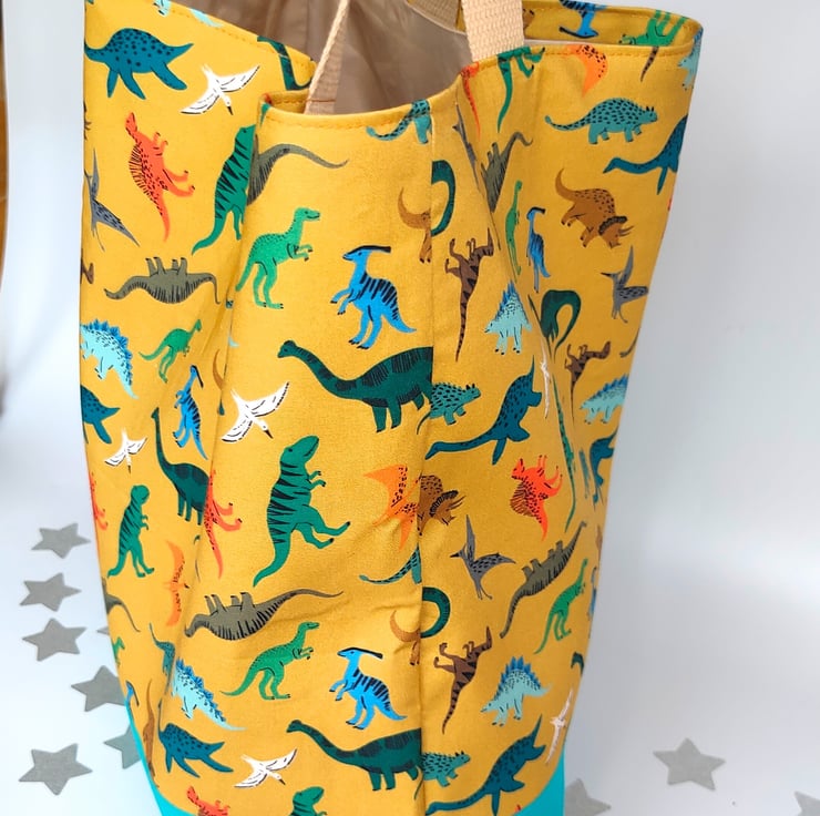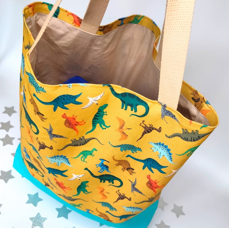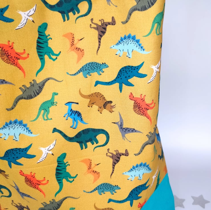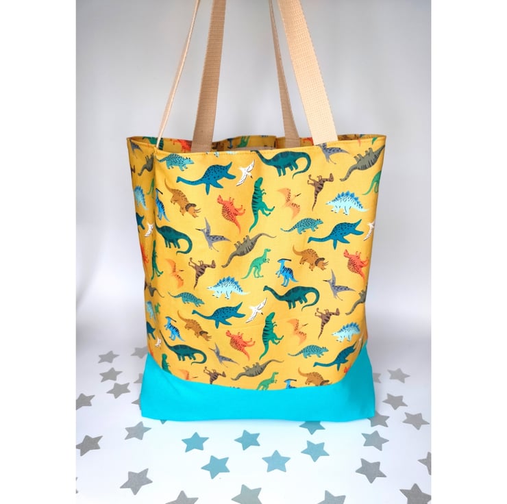 This cute tote bag will give you a spring in your step - it really doesn't take itself too seriously! Super cute dinosaurs cover the mustard cotton which is connected by the bright turquoise canvas base.
