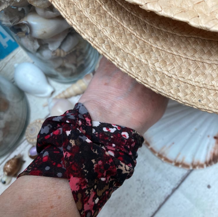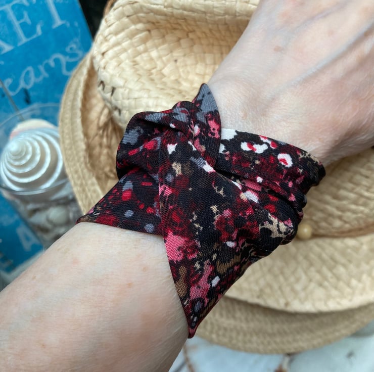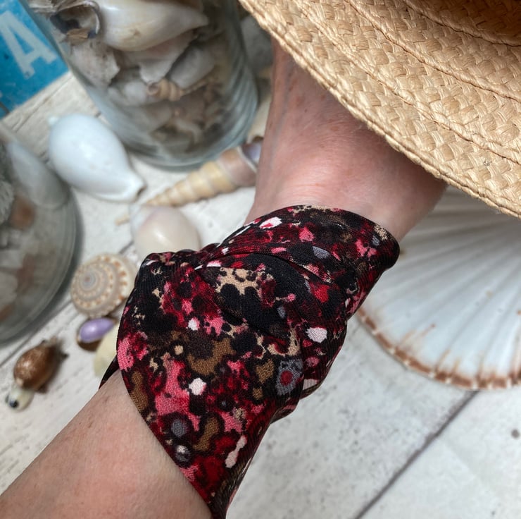 A soft feel to this nice and wide cuff bracelet with its reds, black, grey and specks of white. A lightweight polyester stretch fabric and very soft. Very easy to wear and comfortably fits a 16 cm wrist. (6.5")