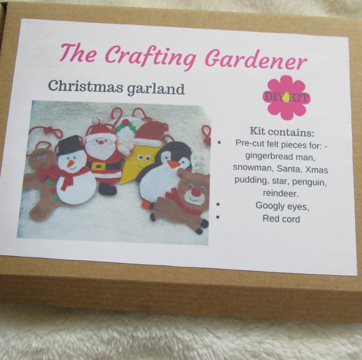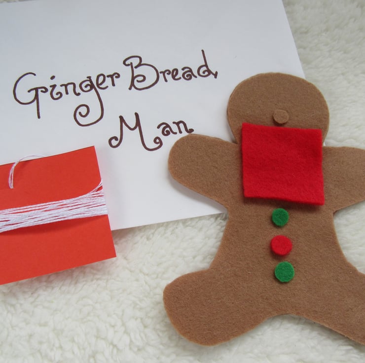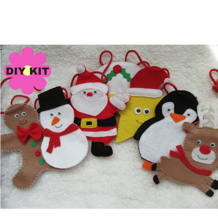 Pre-cut felt pieces for: - gingerbread man, snowman, Santa, Xmas pudding, star, penguin, reindeer.