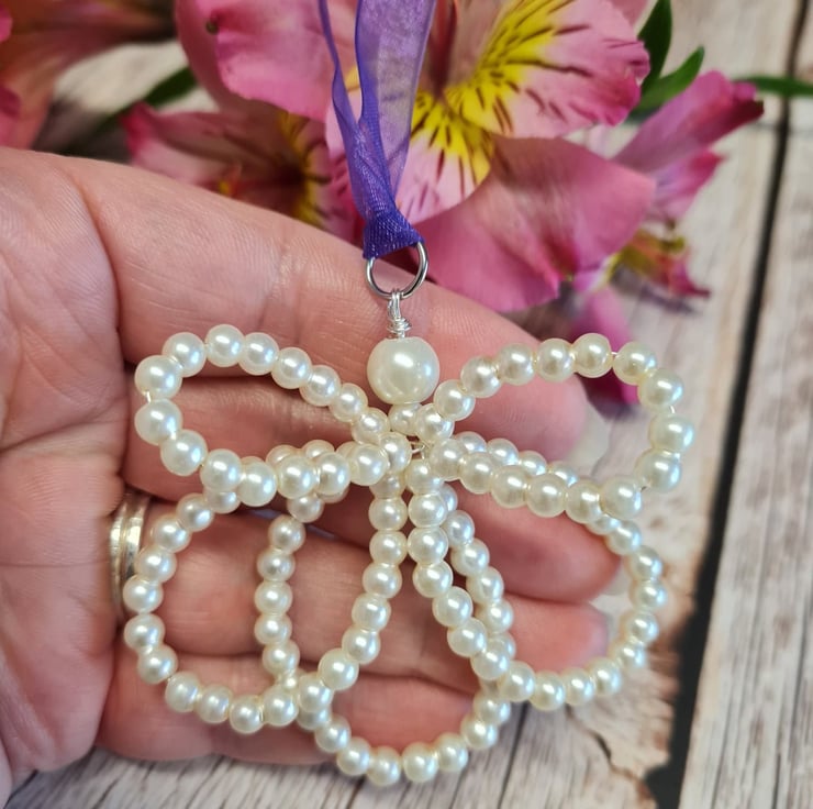 Beaded Angel with 4mm ivory glass pearls with a pretty purple organza ribbon approx 12.5cm length. Makes a beautiful Christmas or all round decoration, perhaps even a Confirmation or Christening gift.