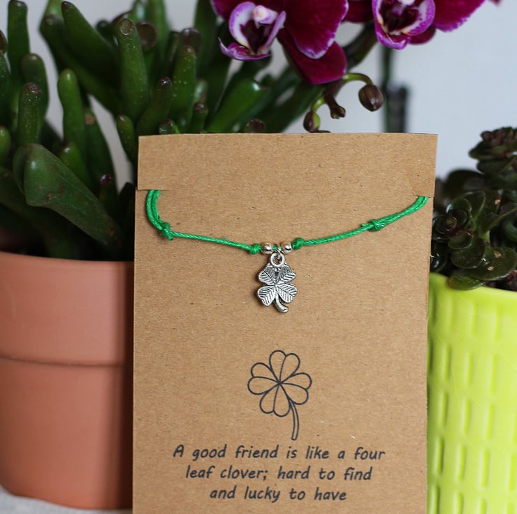 A handmade bracelet available in a choice of 15 colours, made from colourful waxed cord and featuring a Tibetan silver lucky clover charm. The bracelet is size adjustable and presented on a card featuring a fun Irish blessing. Perfect as a gift to inspire a little fun, or as a much deserved treat for yourself. All items are handmade with care and packaged carefully.