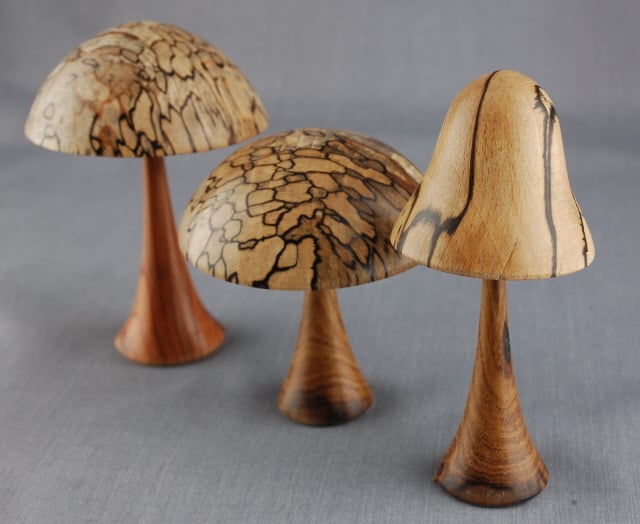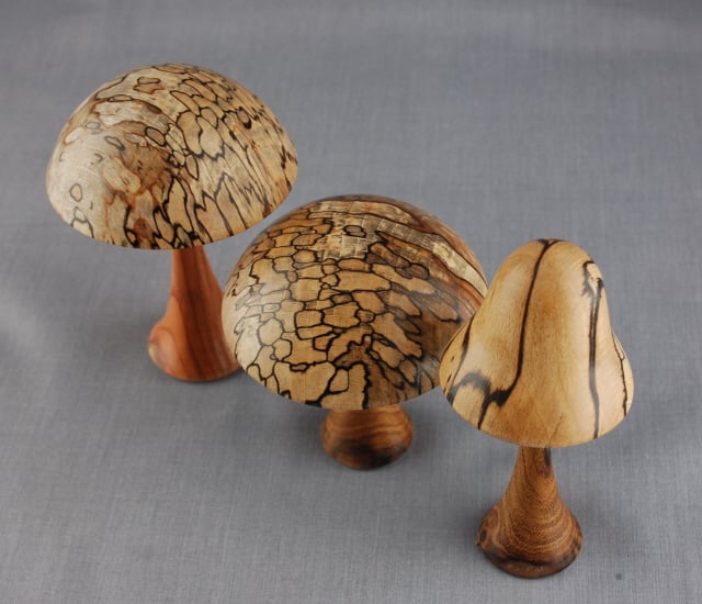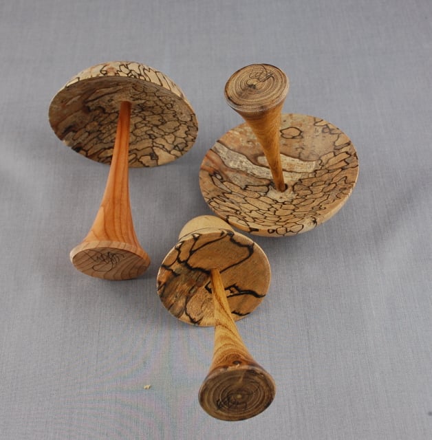 Joy and surprise happens to us when turning away the outer wood, revealing markings that are stunning. The dark erratic lines that dance within the wood happen only in certain circumstances. The tops are held up on stems turned from either local yew or laburnum. This set measures approximately 8 to 10.5 cm high and 4.5 to 7 cm. in diameter.