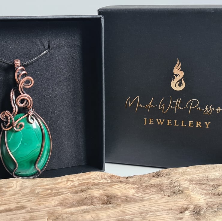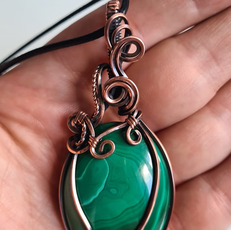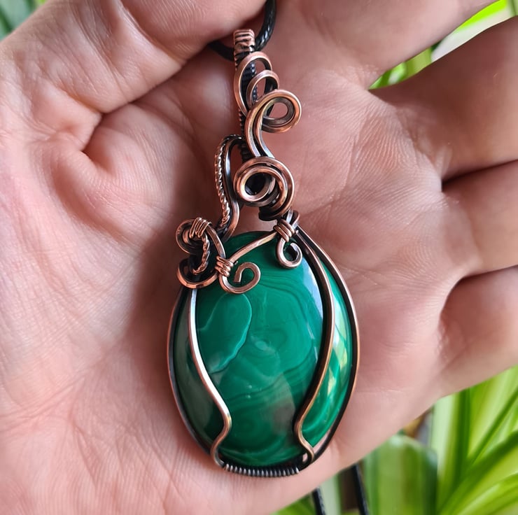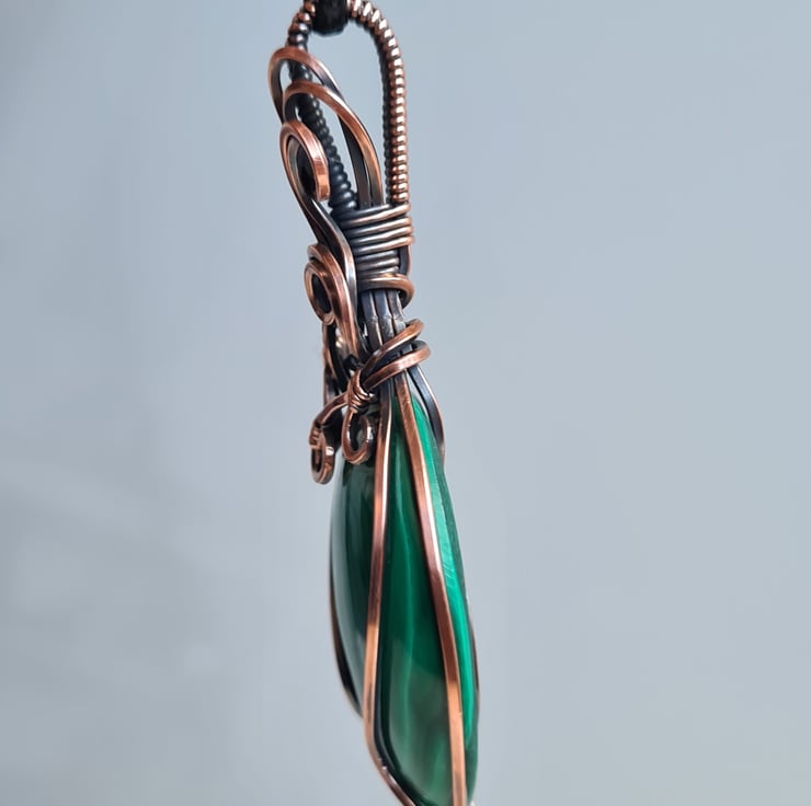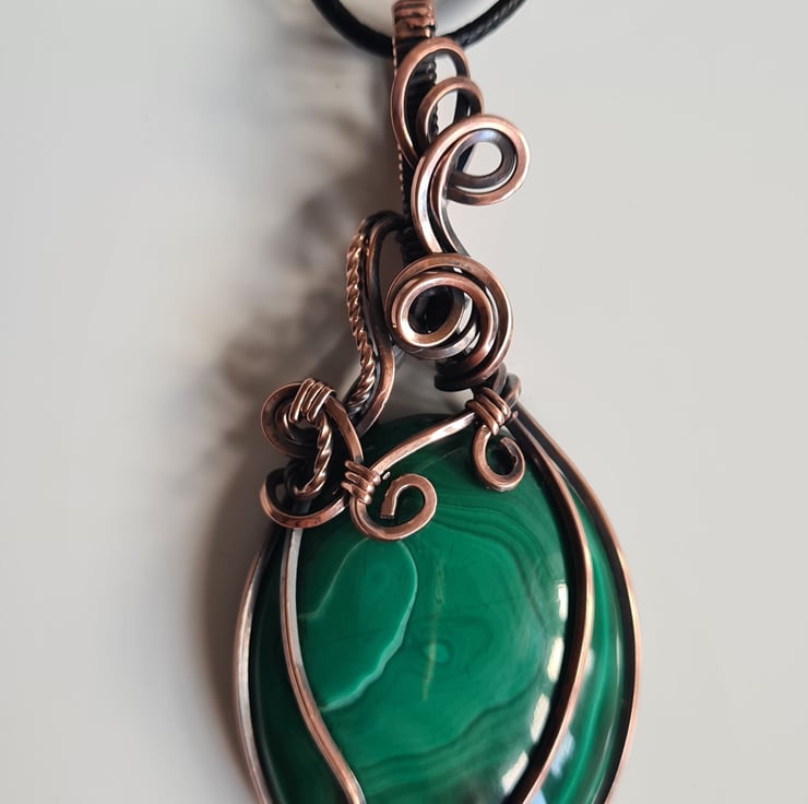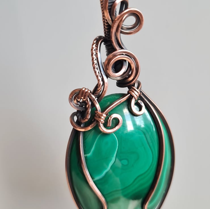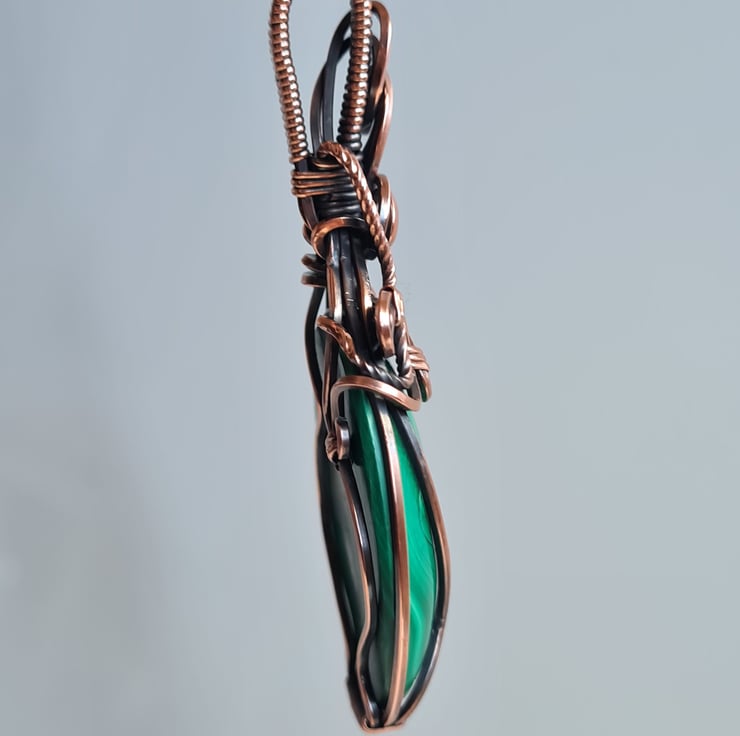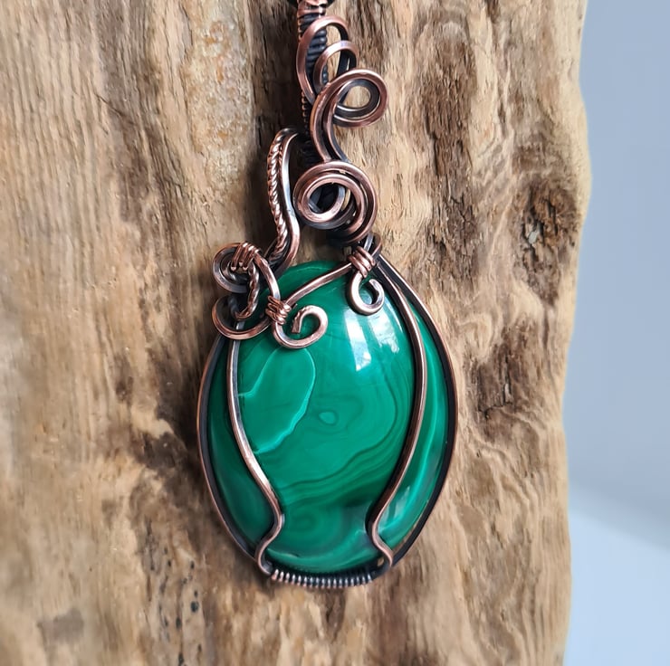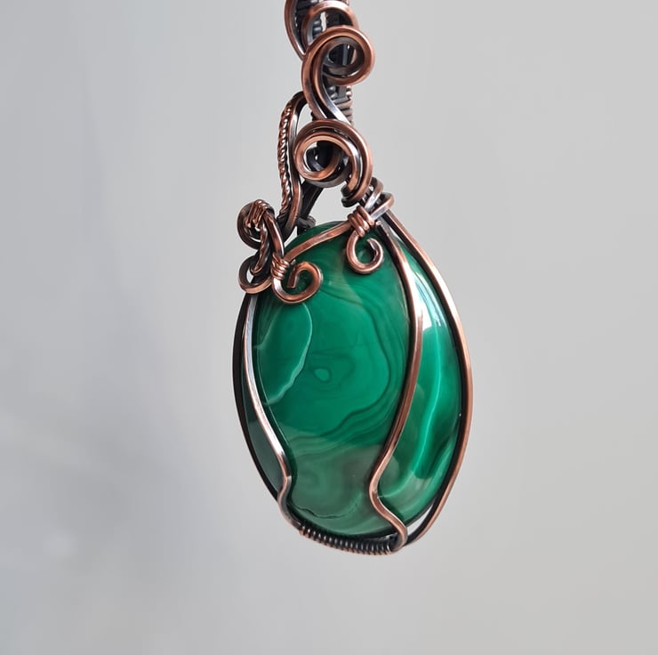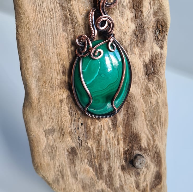 I have hand wrapped this large A Grade Natural Malachite stone into this pure copper design, which I have then antiqued and polished for the final effect.