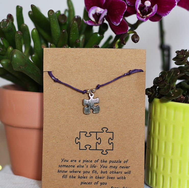 A handmade bracelet available in a choice of 15 colours, made from colourful waxed cord and featuring a Tibetan silver jigsaw piece charm. The bracelet is size adjustable and presented on a card featuring a thoughtful quote from Bonnie Arbon. Perfect as a gift to inspire a little love, or as a much deserved treat for yourself. All items are handmade with care and packaged carefully.