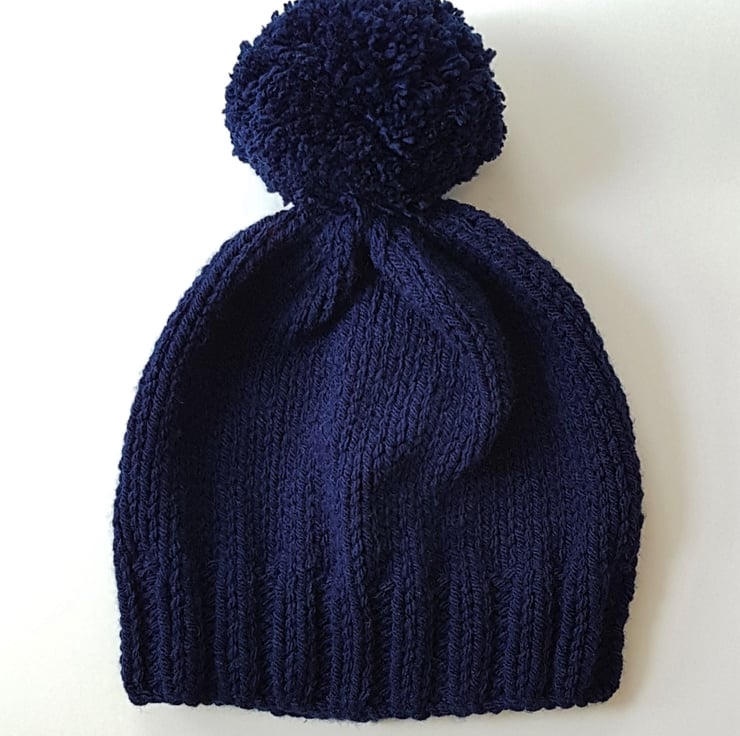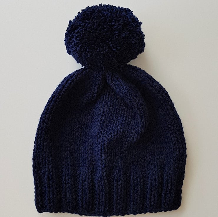 This bobble hat is hand knitted in navy blue chunky acrylic yarn with a large navy blue chunky and squishy pom pom sewn on.