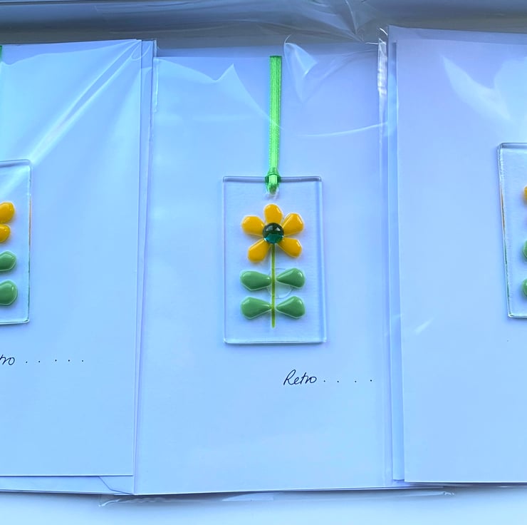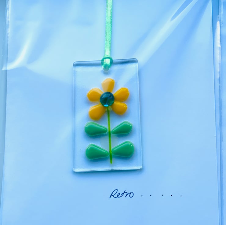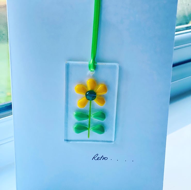 Gorgeous mini glass hanging / bookmark can simply be detached after the card is no longer needed as a keepsake . Perfect for birthdays, get well , thinking of you or any other event . The glass decoration is approximately 1 inch x 3 inch , drilled and supplied with extra long ribbon . Customers use them to hang around their home, on the tree at Christmas or as a pretty bookmark .