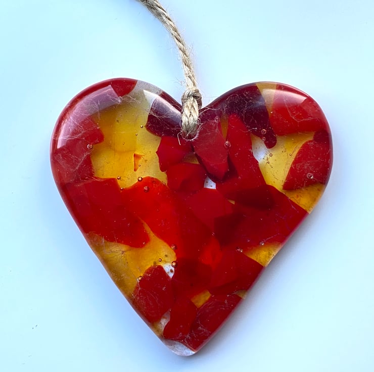 So pretty these cast glass hearts are beautiful and there will never be two the same . Designed to hang on the wall . The hearts are drilled and hung with jute . They are approximately 1/4 inch thickness and 4 inch diameter . A very pretty affordable gift .