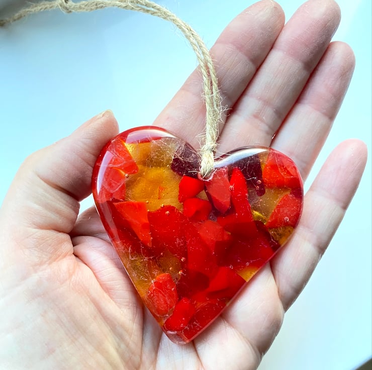 So pretty these cast glass hearts are beautiful and there will never be two the same . Designed to hang on the wall . The hearts are drilled and hung with jute . They are approximately 1/4 inch thickness and 4 inch diameter . A very pretty affordable gift .