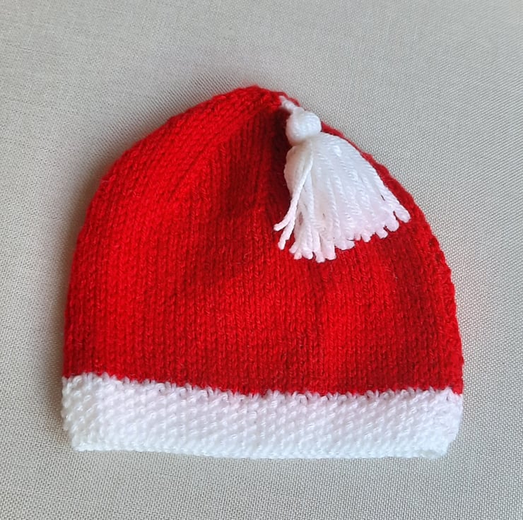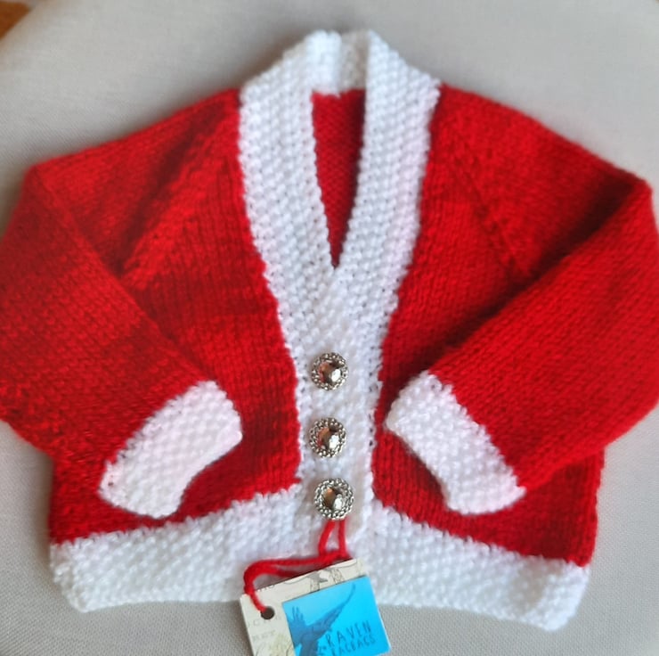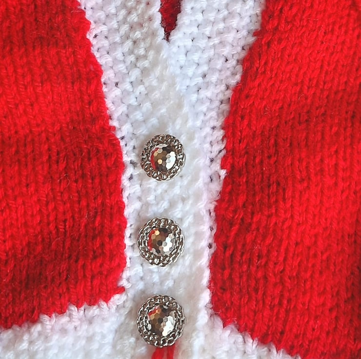 A cute little handknitted festive outfit for Baby's first Christmas with a cardigan and matching beanie hat. Handknitted in soft feel vegan-friendly acrylic yarn. This outfit can be washed at 30 degrees centigrade. To fit from birth to 3 months, the cardigan has 3 sparkling silver buttons and the hat has a jaunty tassel.
