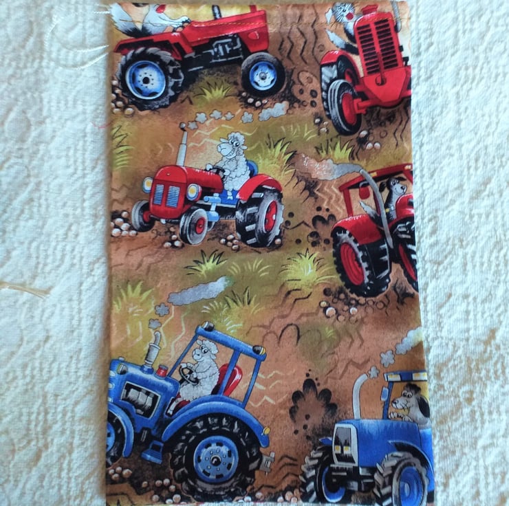 These four bags of various sizes all have tractors depicted on the fabric. Three are creamy-white with tiny red, green, blue and orange tractors in stripes across them. The other one is an earthy brown, with red and blue tractors driven by dogs and sheep. This is the largest bag and measures 9.5" (24 cm.) by 6" (15 cm.). The smallest, white, is 4" (10 cm.) by 3" (8 cm.). All are made of good quality cotton and are fully washable and reusable.