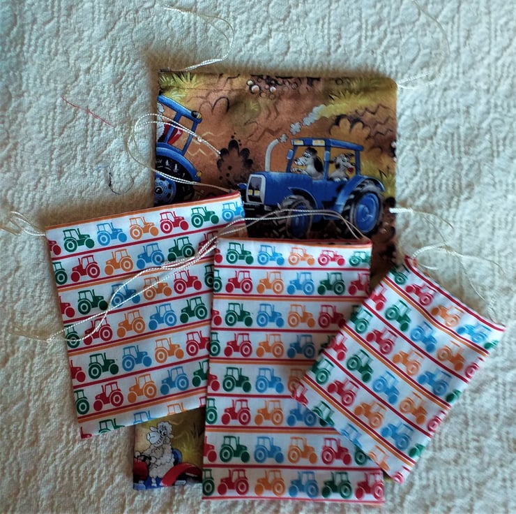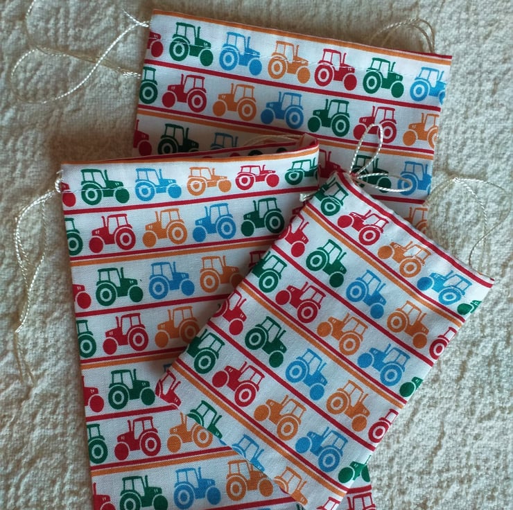 These four bags of various sizes all have tractors depicted on the fabric. Three are creamy-white with tiny red, green, blue and orange tractors in stripes across them. The other one is an earthy brown, with red and blue tractors driven by dogs and sheep. This is the largest bag and measures 9.5" (24 cm.) by 6" (15 cm.). The smallest, white, is 4" (10 cm.) by 3" (8 cm.). All are made of good quality cotton and are fully washable and reusable.