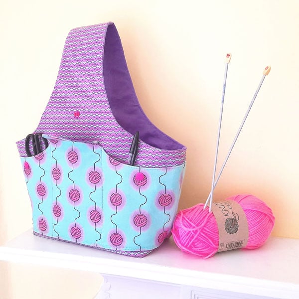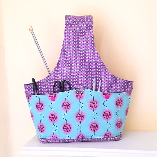 This Selkirk Sling Knitting / Crochet Project Bag is made from our Yarn Ball and Plain Knit fabrics and is quilted. It has a lilac cotton lining and 5 exterior pockets with pink snap closures, 3 on the front and 2 on the back with room for circular / short knitting needles/ crochet hooks, scissors, a pattern and other accessories. There is also a metal D ring on the back to store stitch markers.
