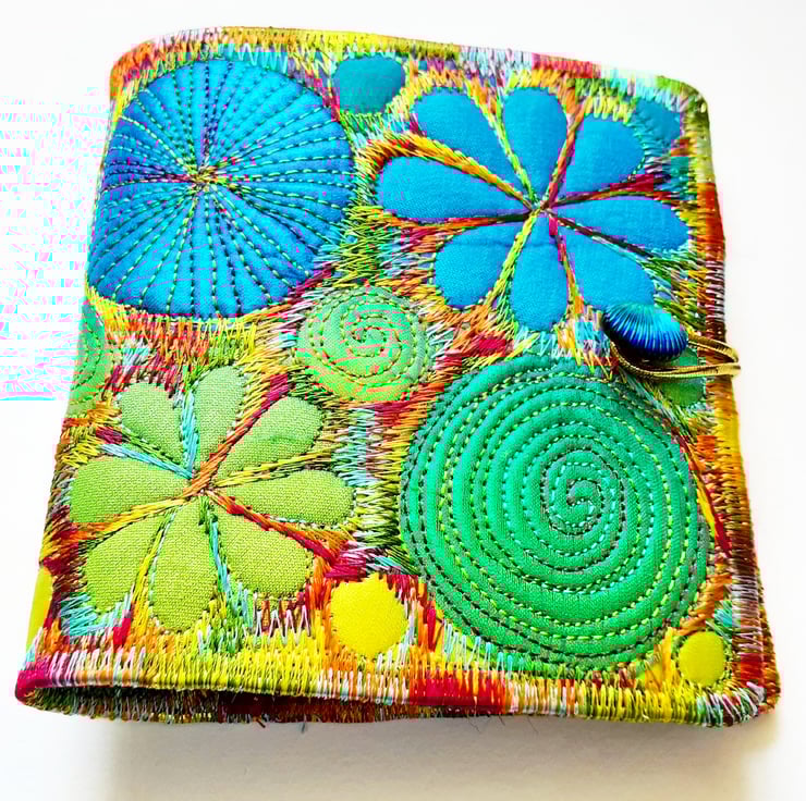 Made from layers of fabric including hand dyed Egyptian cotton and silk fabrics using the free machine embroidery style of sewing