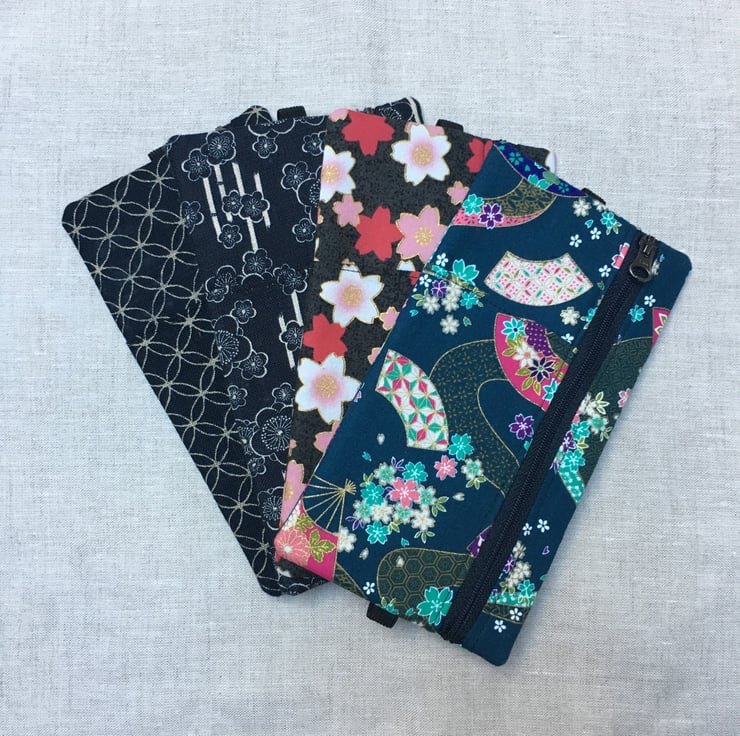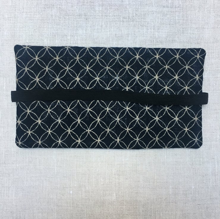 The pencil case has been handcrafted from Japanese fabric. The pattern is called Shippo or Seven Treasures and is a traditional Japanese pattern. It is a dark indigo and has a soft linen feel to it. It will become softer the more it is handled. The case has been interfaced with light padding to give structure to it.