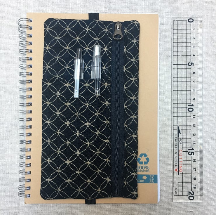 This pencil case has been designed with practicality in mind. It is able to fit around an A5 diary, journal or notebook. It has a front pocket to keep pens handy as well as a zipped section to keep belongings secure. The zipped section will fit a phone, depending on the size.