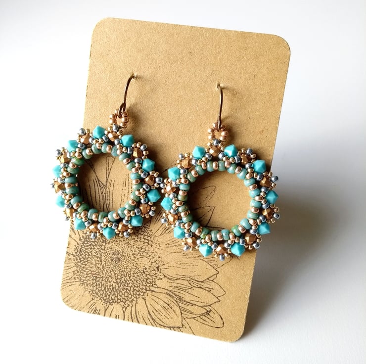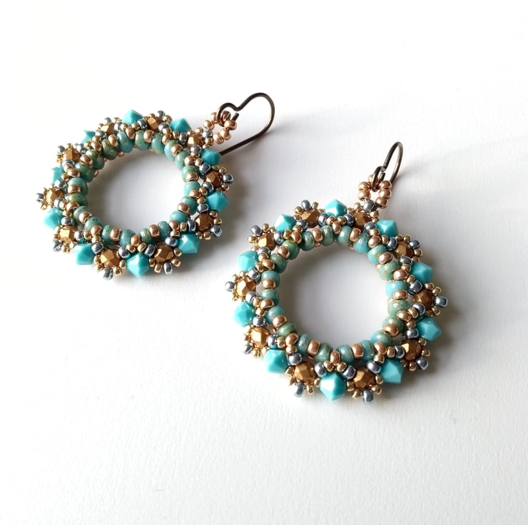 Twin-holed beads have been used to form a solid ring and then embellished with crystals and seed beads. This pair features pretty Preciosa 4 mm crystal bicones in turquoise - they are a "solid" colour rather than the clear ones I tend to use - plus faceted 3 mm matte bronze-coloured beads together with seed beads in ice blue and light gold.