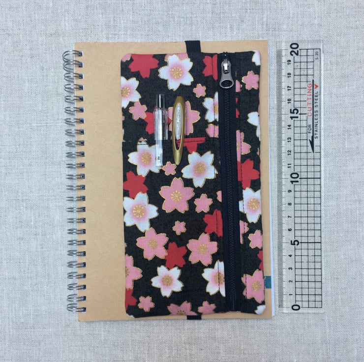 The pencil case has been handcrafted from Japanese fabric. The fabric has cherry blossoms in white and pink with a gold outline and centre as well as plain red blossoms on a mottled black background.
