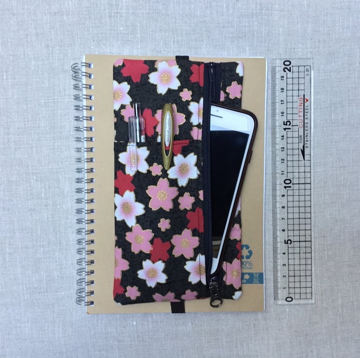 This pretty pencil case has been designed with both aesthetics and practicality in mind. It is able to fit around an A5 diary, journal or notebook. It has a front pocket to keep pens handy as well as a zipped section to keep belongings secure. The zipped section will fit a phone, depending on the size.