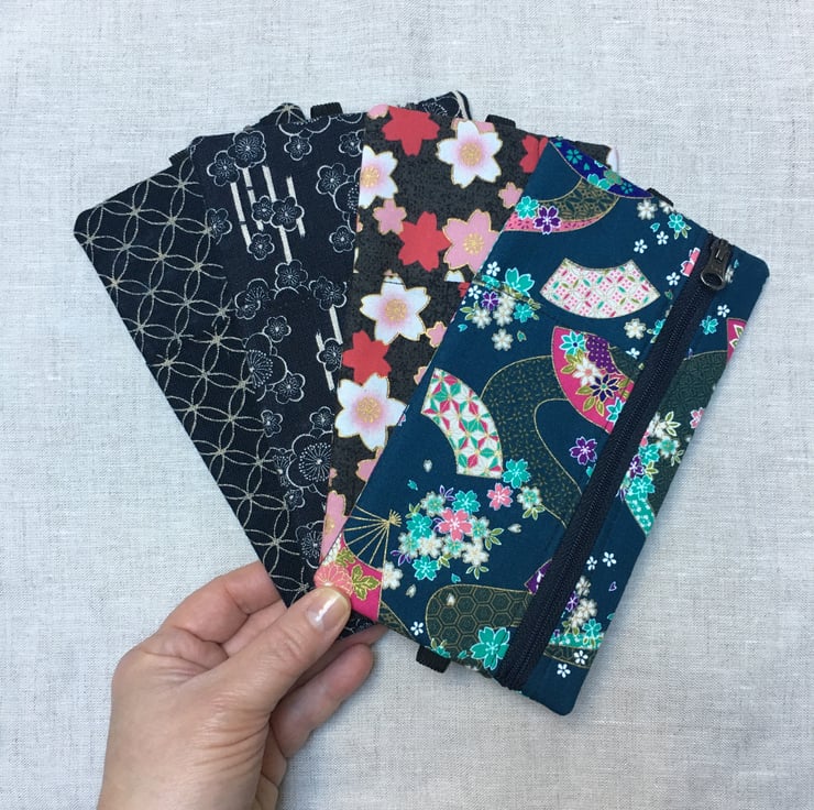 The case has been interfaced with light padding to give structure to it. The inside has been lined with a patterned cotton fabric that complements the outer fabric. The zip is a YKK zip.