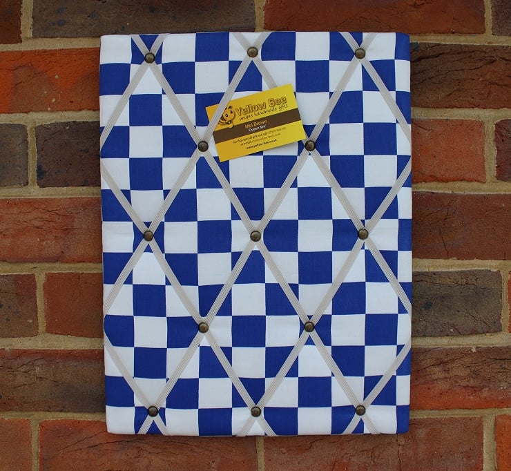 Padded Memo Board in Blue Check fabric. The board has white elastic straps for ease of holding business cards, photos, notes, appointments etc. There is a saw tooth picture hanger on the back for hanging the notice board up and the back is covered with a suitably coloured felt. Approx. dimensions: 30cm wide x 40cm long