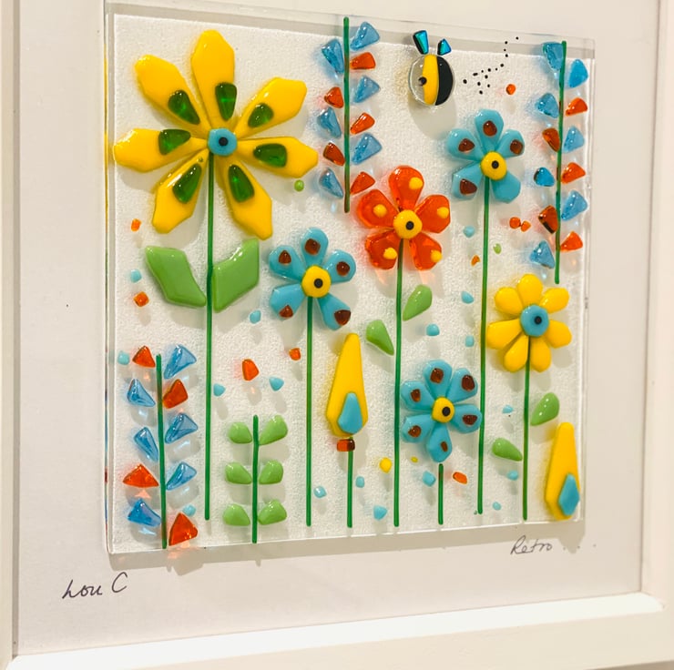 Created entirely from hand cutting sheet glass and kiln forming . Beautiful fresh colours give this retro inspired piece a scandi feel . The fused glass panel is fixed in a white wooden frame which is approximately 25 cm square . A beautiful fused glass picture that would make a wonderful gift