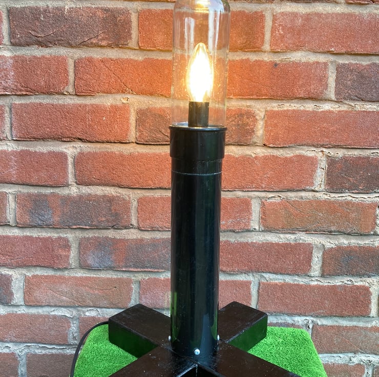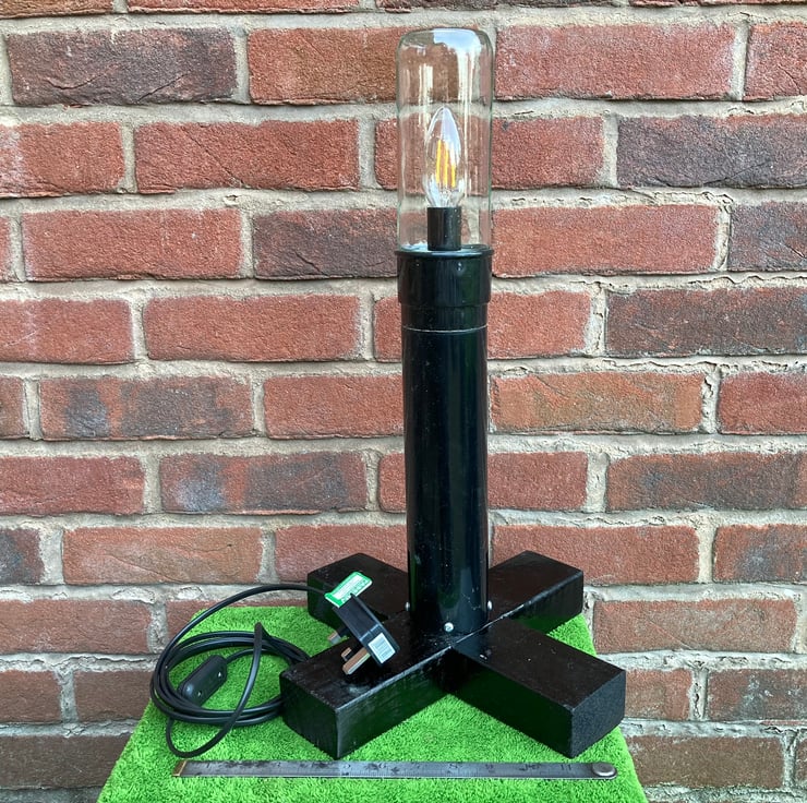 The jar has been thoroughly cleaned and a black resin small Edison screw (SES, E14) lampholder fitted inside holding a 4.4 Watt LED candle bulb. These LED bulbs are very economical to run and give off very little heat so are suitable for an enclosed space like this. I have mounted the jar upside-down onto a post made from a length of drainpipe fitted to a base of black painted reclaimed timber. Power is supplied through over 2 metres of inconspicuous black flex fitted with a black inline switch and black 3 pin plug with the correct 3A rated fuse.