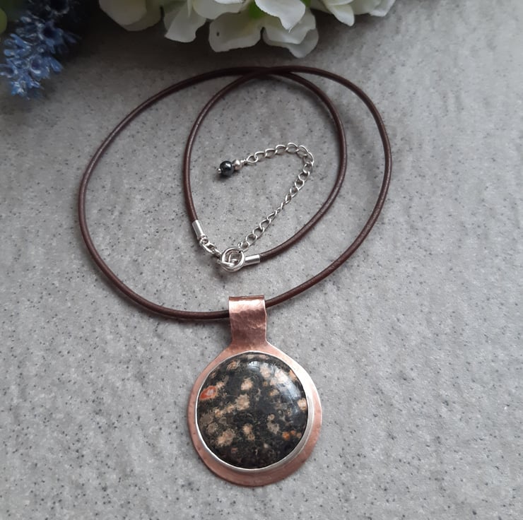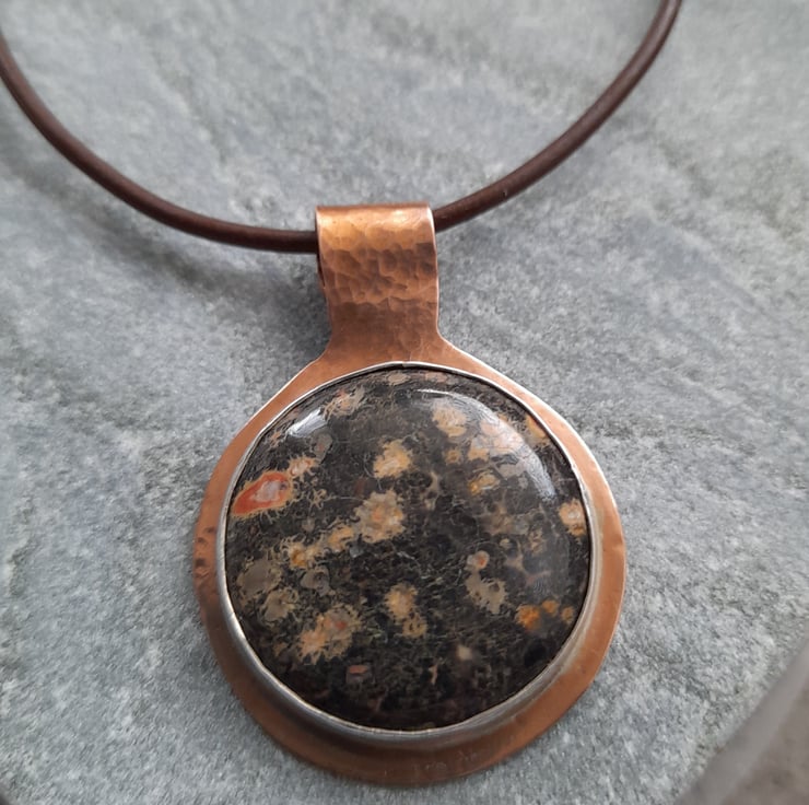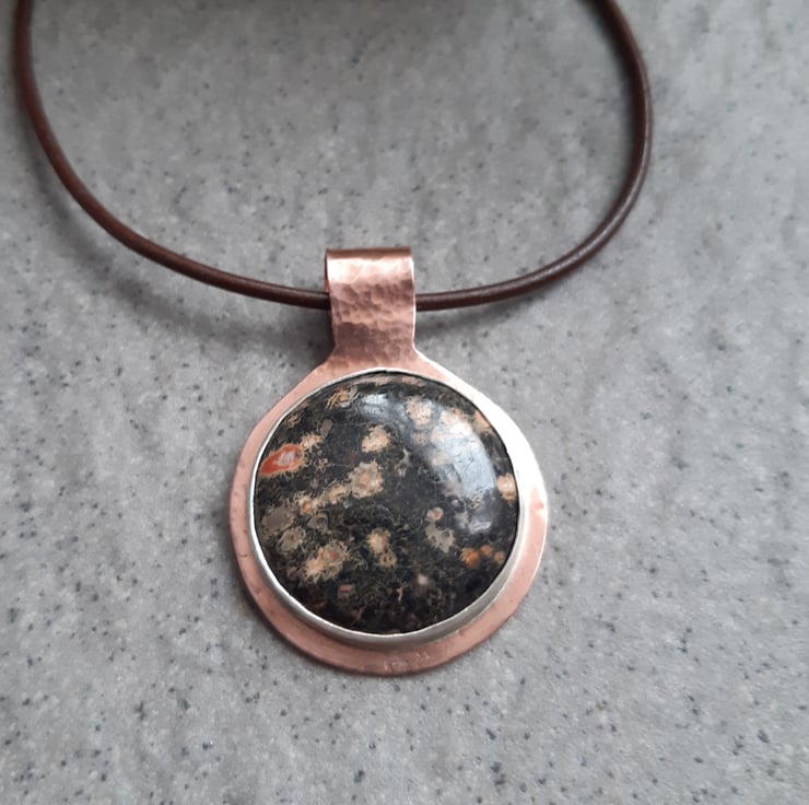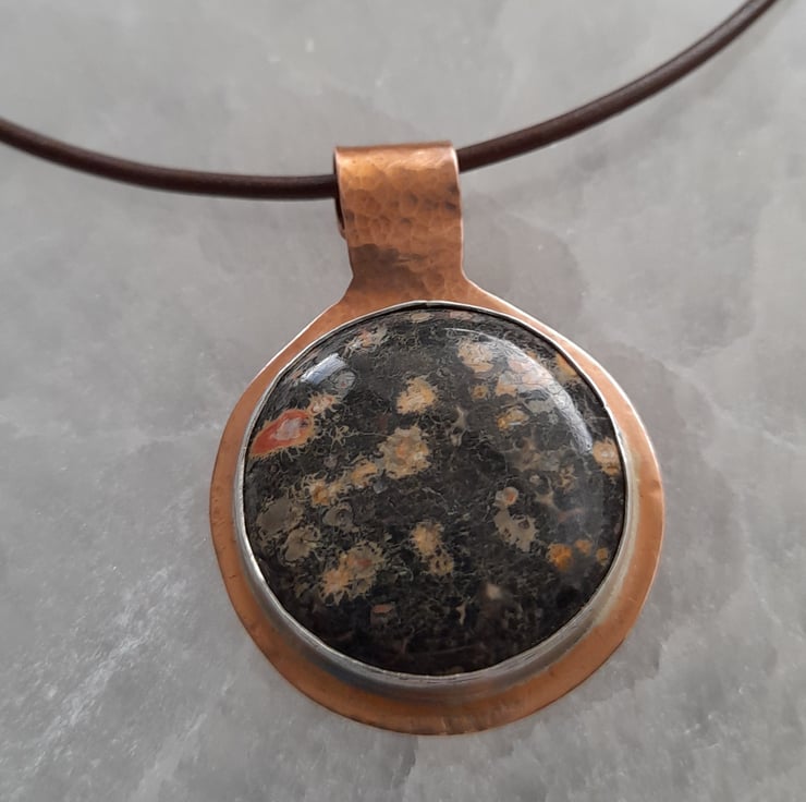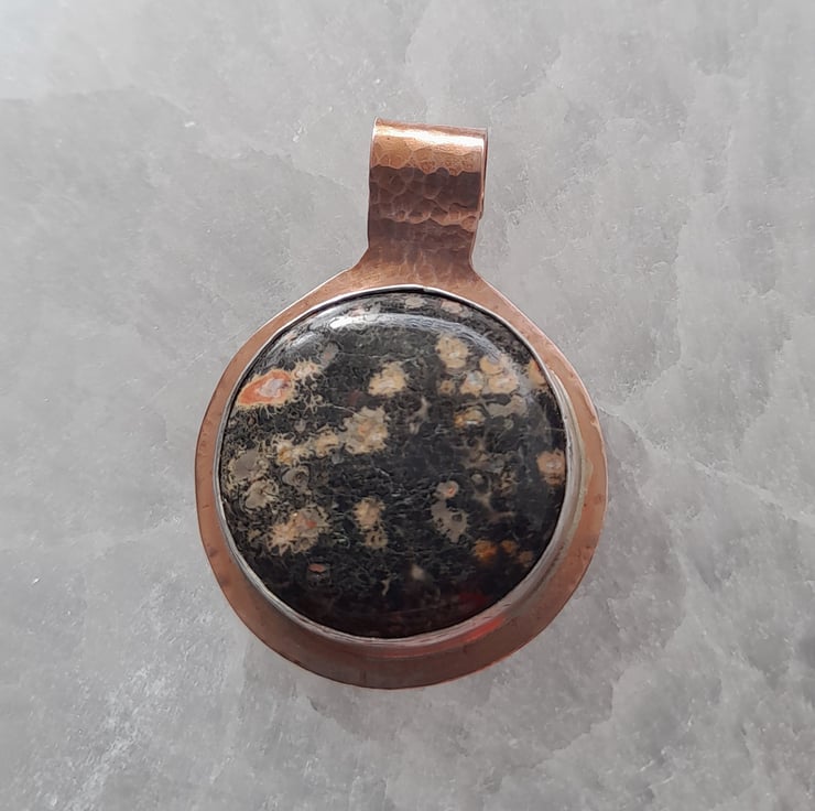Seconds Sunday Leopard skin jasper round semi-precious gemstone which has been bezel set onto a copper base with fine silver, Copper has been lightly hammered to give texture.