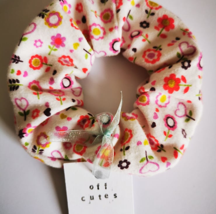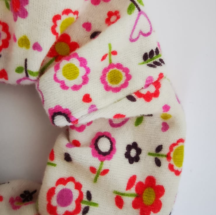 This was my daughters babygro, a long long time ago! Recycled into a lovely soft cotton scrunchie with cartoon flowers.