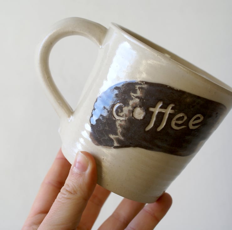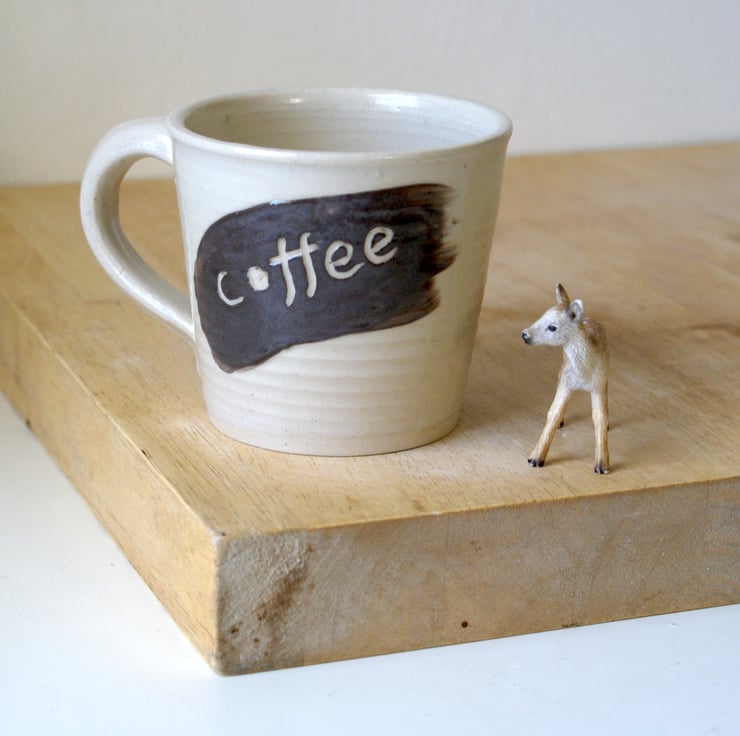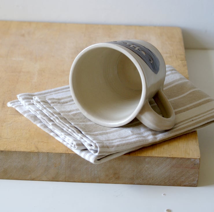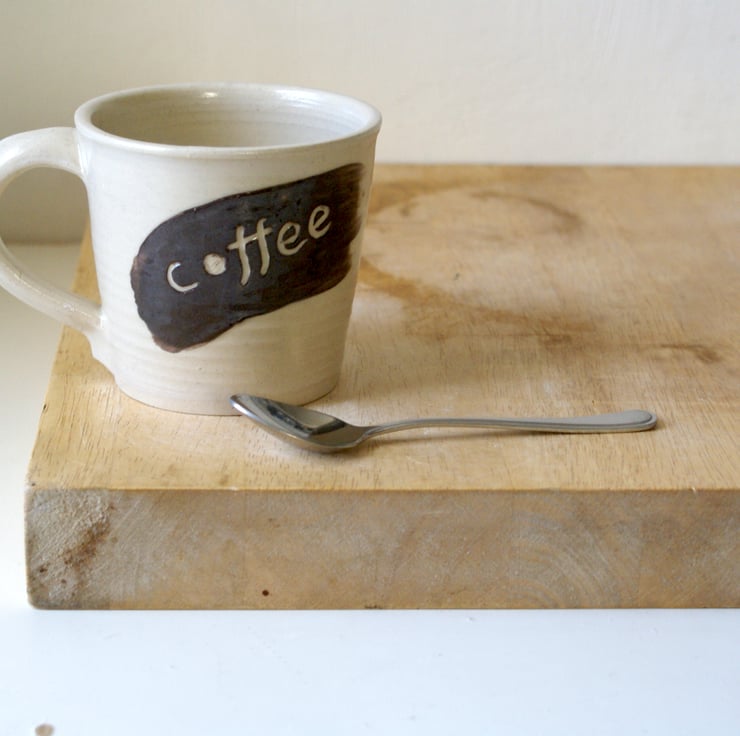 This mug was hand thrown on my potters wheel and glazed in simply clay. It features a straight sided v shape with a rounded rim and textural throwing rings so you can feel where my hands have drawn the clay upwards during throwing. Each one has been decorated with swipe of brown slip and then etched with 'tea' and 'coffee'.