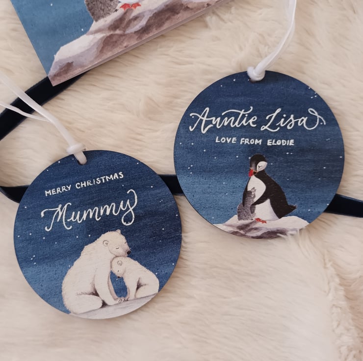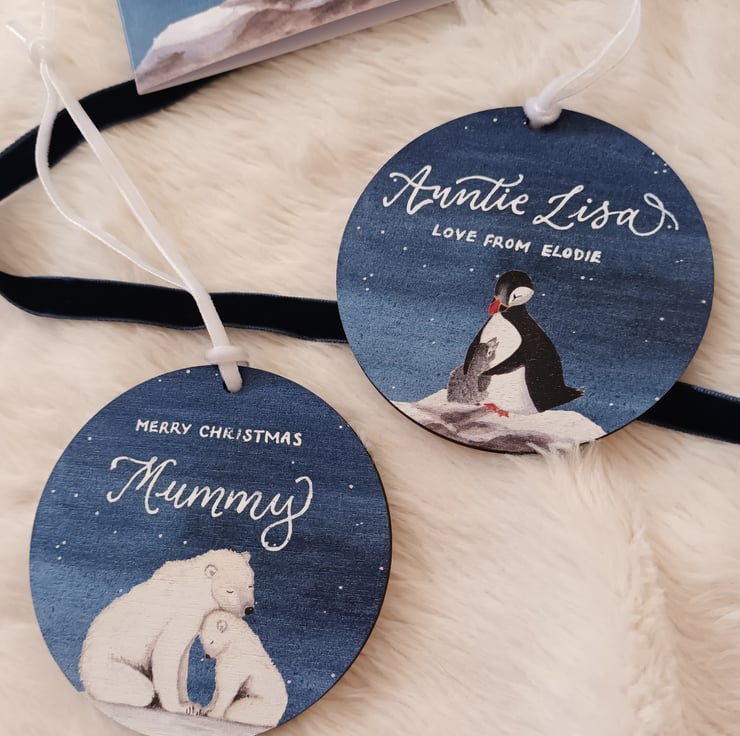 This 8cm diameter tree decoration is cut from sustainable birch wood and is printed on one side with this lovely design. Includes a white velvet ribbon, ready to hand on your tree.