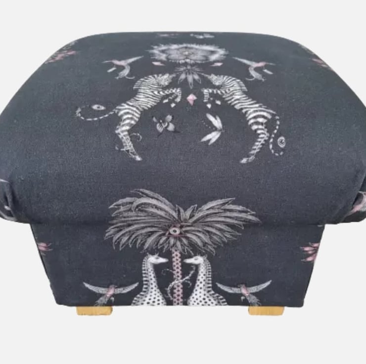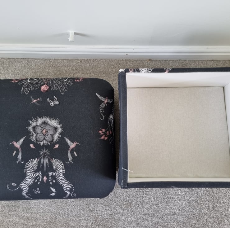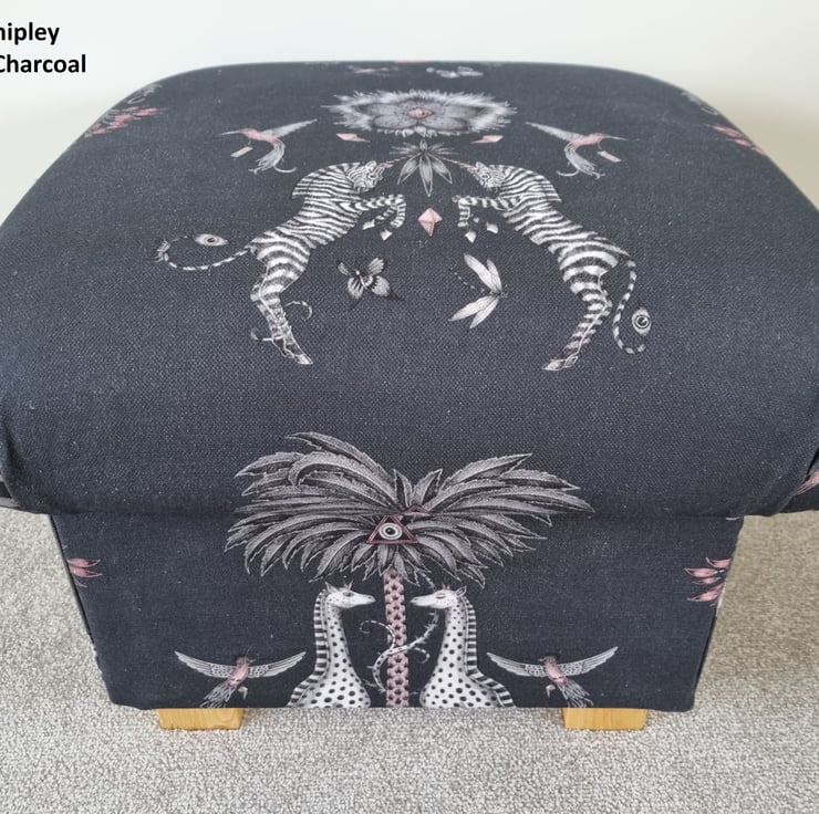 I am a professional upholsterer with over 33 years and have made this storage footstool myself, using Emma J Shipley Creatura Charcoal Grey fabric.
