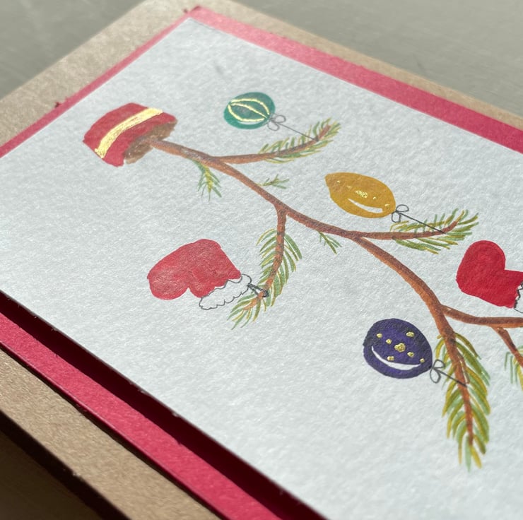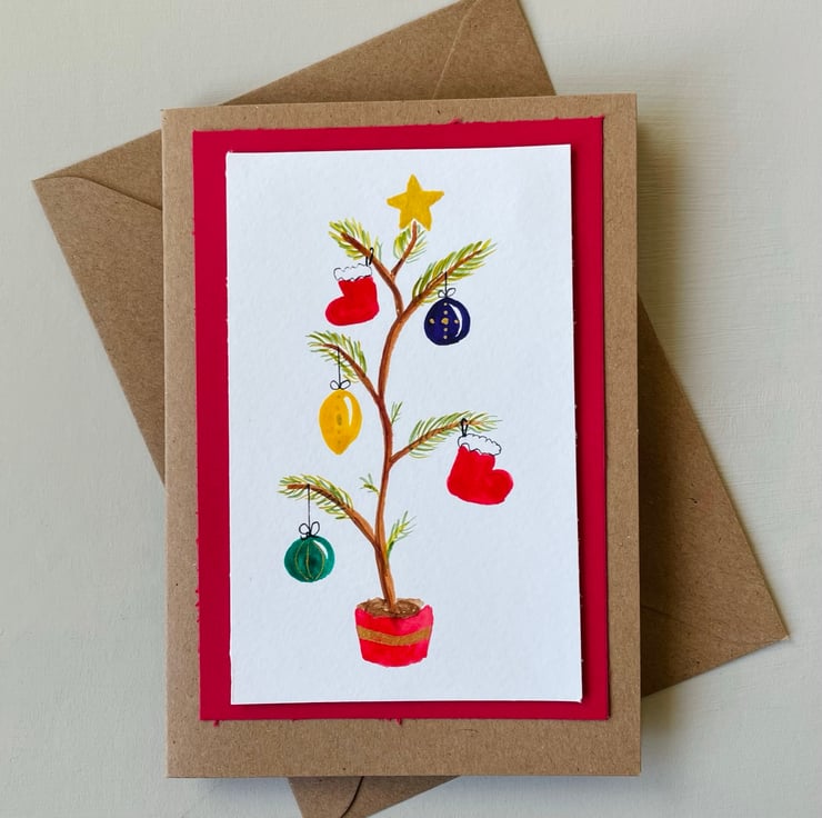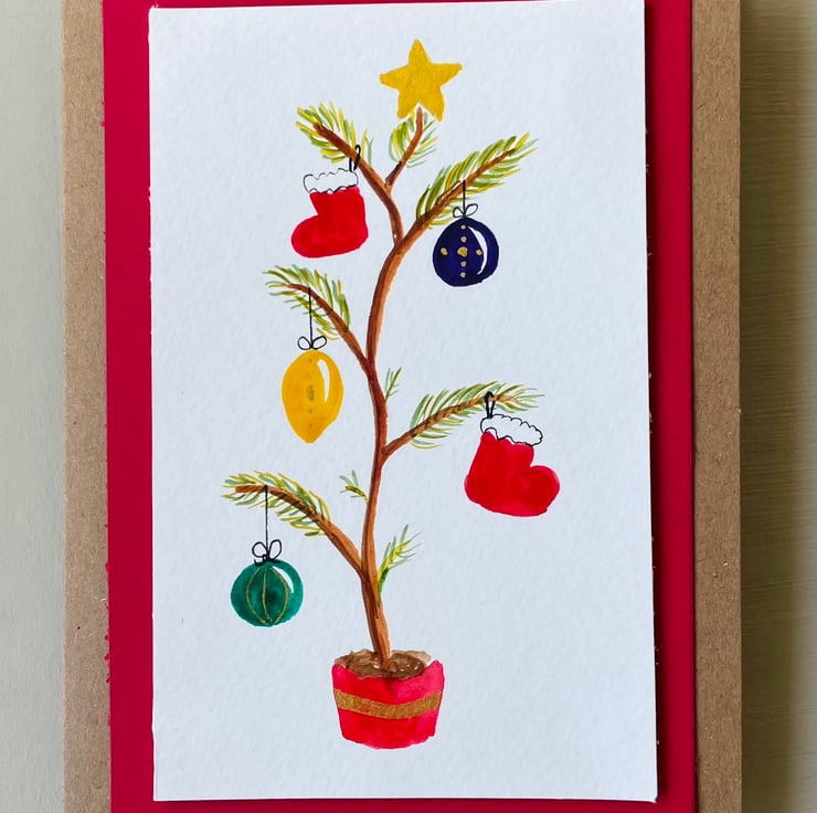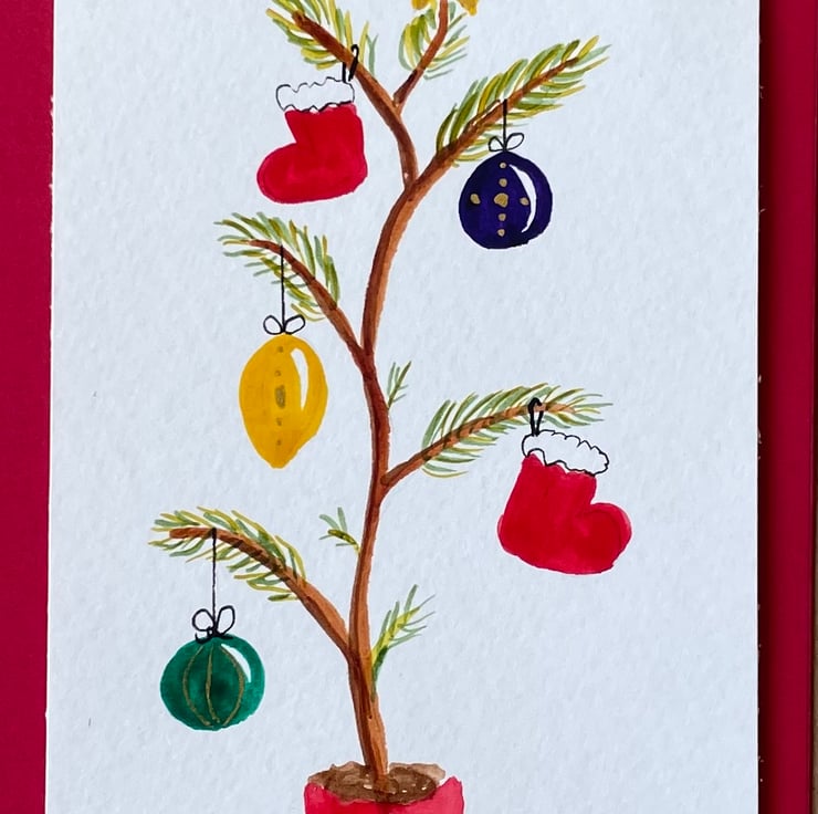This Christmas card features a little fir tree branch in a red pot, with stockings and baubles and a shiny gold star on top. It is a seconds Sunday card as there is minor mis shape to the bottom left corner of the watercolour paper it is painted on, perfectly imperfect but still perfectly useable.