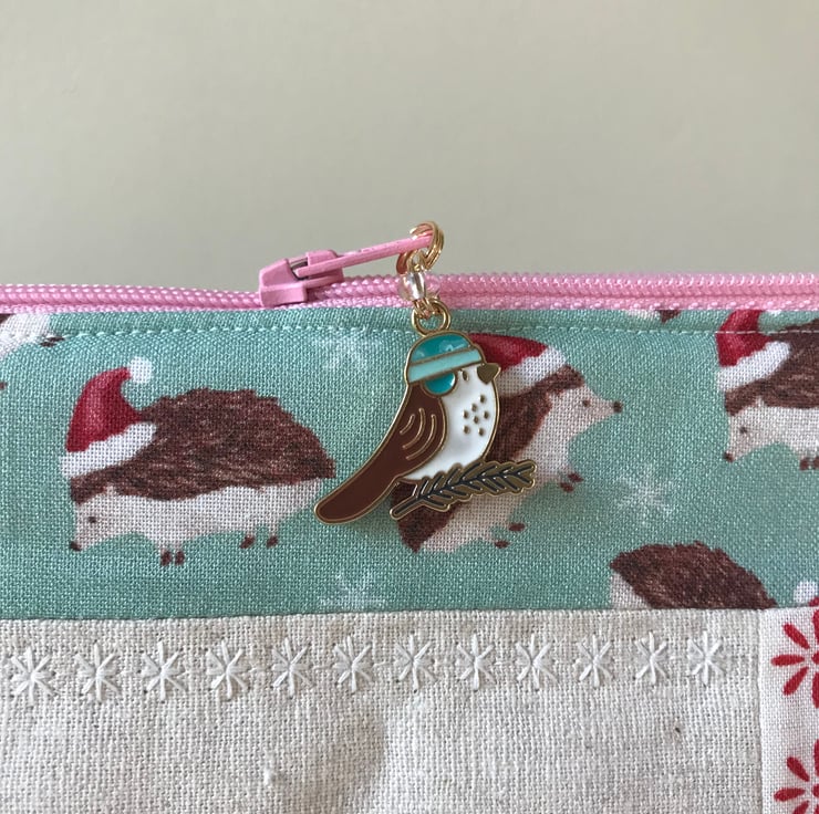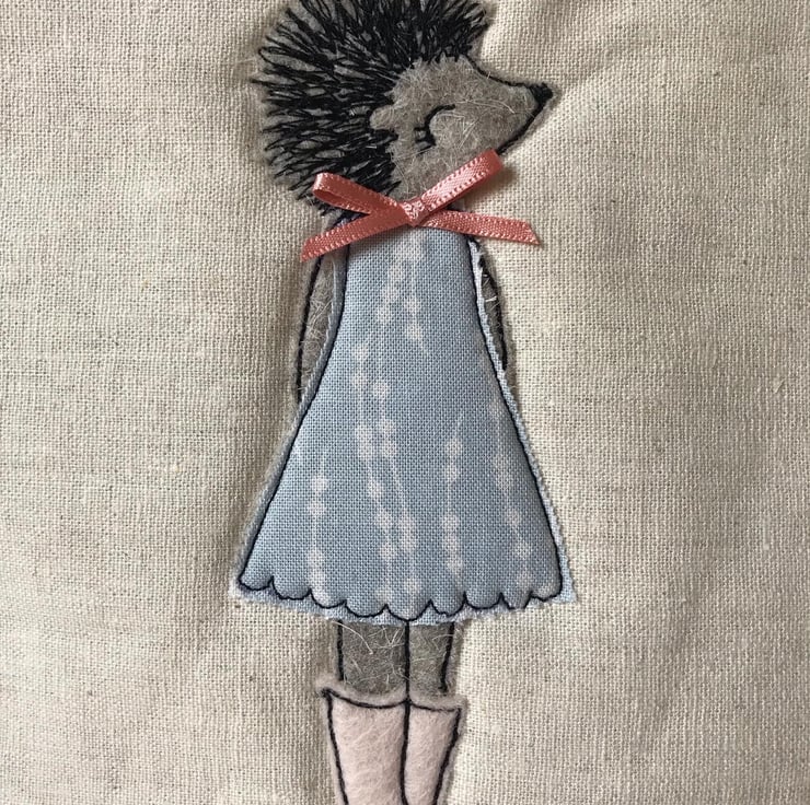 I have free motion embroidered Harriet on some beautiful natural linen, she has a pretty ribbon bow and a lovely cheeky little bird zip pull.
