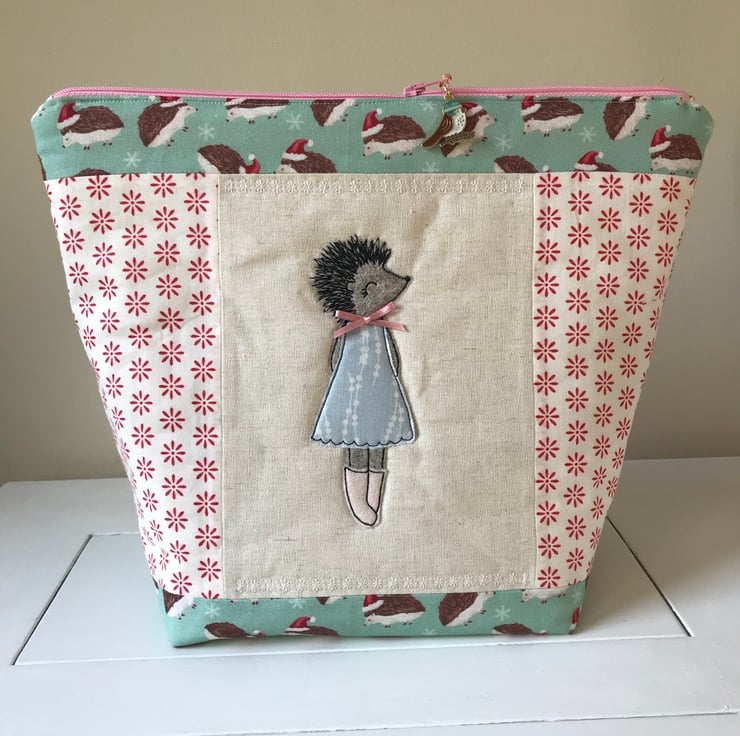 Here is Harriet the hedgehog on a beautiful festive project bag.
