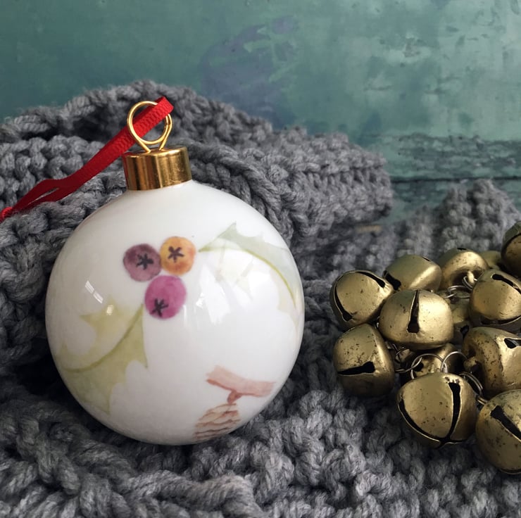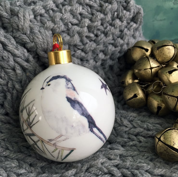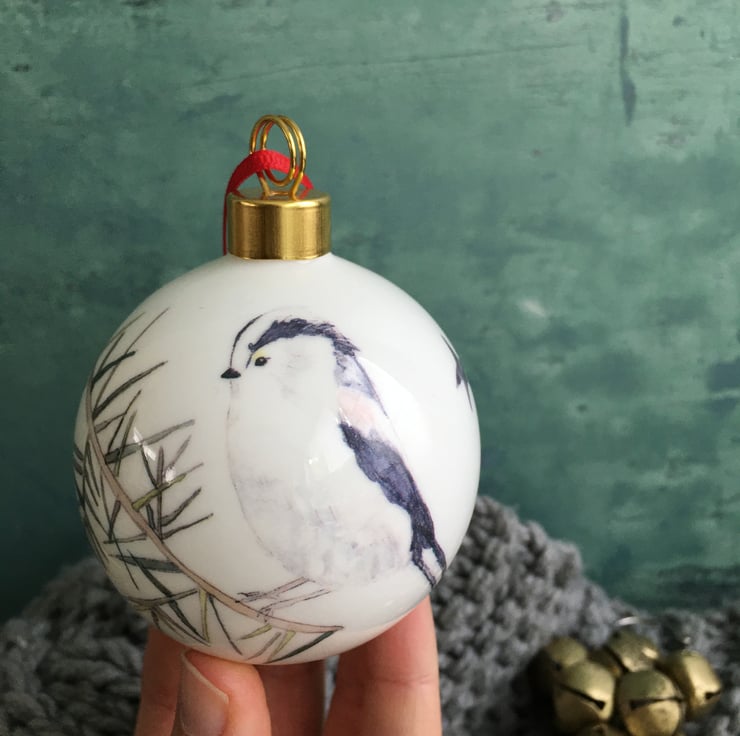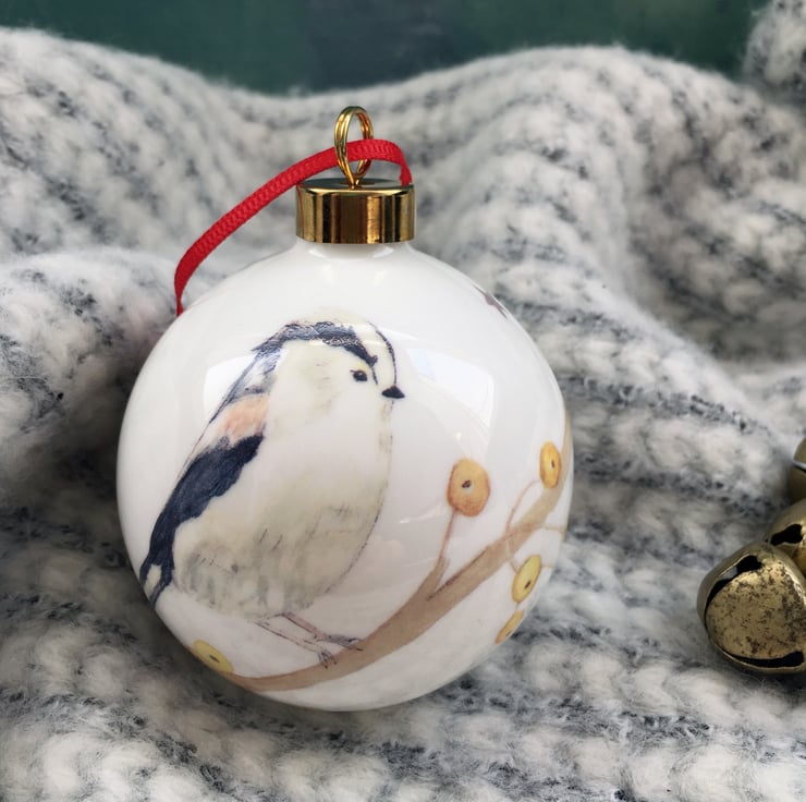 My watercolour paintings of a long tailed tit is printed as a ceramic transfer and then hand cut and applied to a fine bone china Christmas tree bauble. Each bauble will have a different combination of imagery meaning each one is unique, creating a special heirloom decoration that can be treasured each year.