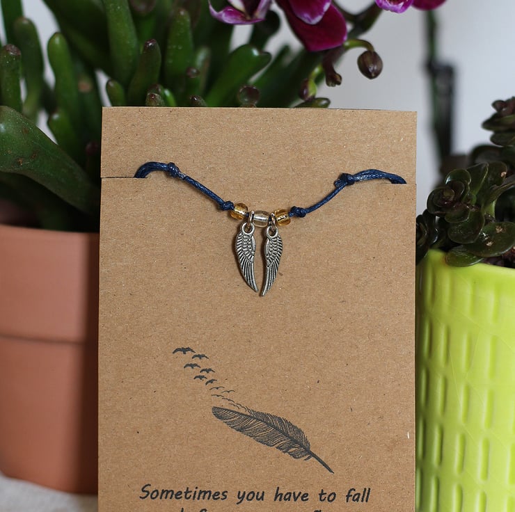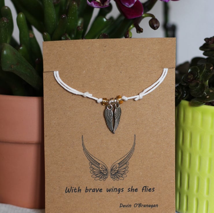 A handmade bracelet available in a choice of 15 colours, made from colourful waxed cord and featuring a Tibetan silver angel wings charm. The bracelet is size adjustable and presented on a card featuring a inspiring quote. Perfect as a gift to inspire a little hope, or as a much deserved treat for yourself. All items are handmade with care and packaged carefully.