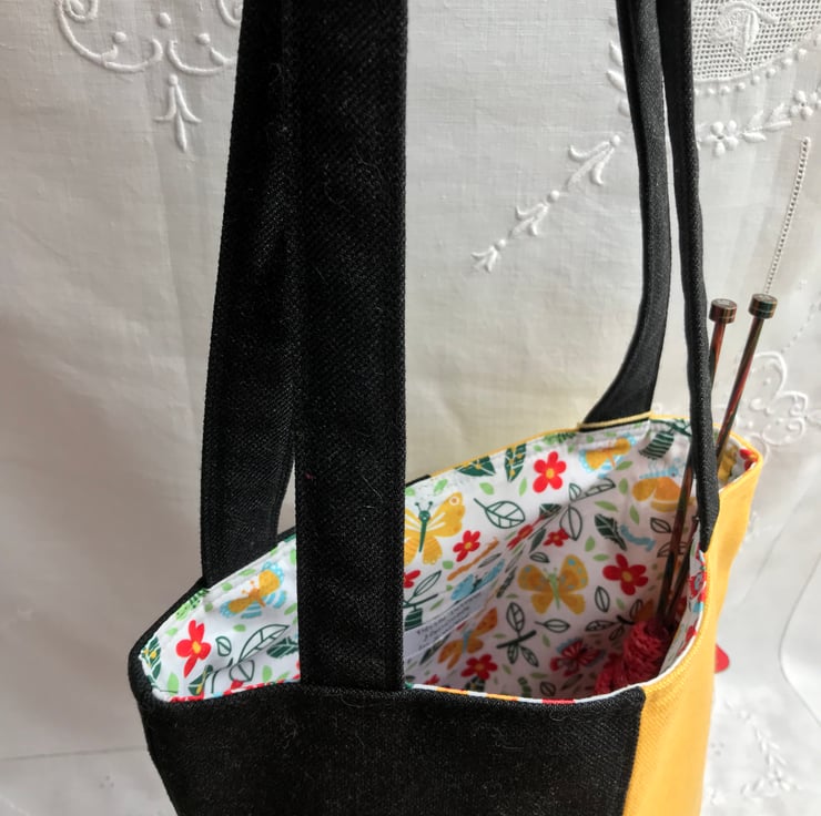 This project bag is an early sample and made with a high quality wool (black) and yellow cotton canvas. The style of this bag will remain within the product range but the mix of wool and cotton makes it quite expensive. Future bags of this style will be made with cotton canvas for both colours. It’s a great size for smaller projects such as cowls (there are 4 cowls inside the bag to prop it up in the photos) or shawls. The base has an insert made from bosal r to protect the needle points. The needles in the image are 35cm. Please note any yarn, needles or accessories in the images are for demonstration purposes. The approximate dimensions are H 11” x W 10” x D 4”.
