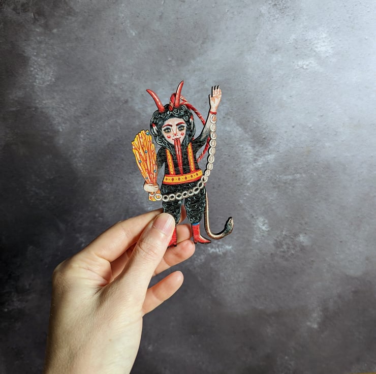 A retro style Christmas Krampus hanging decoration- he's waving hello to you! Perfect for those who like a gothic or creepy Christmas.