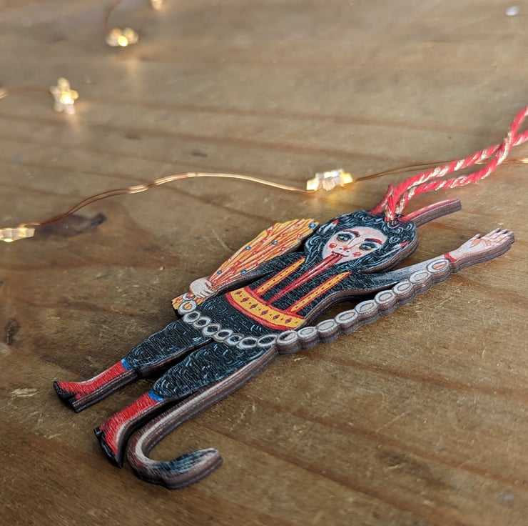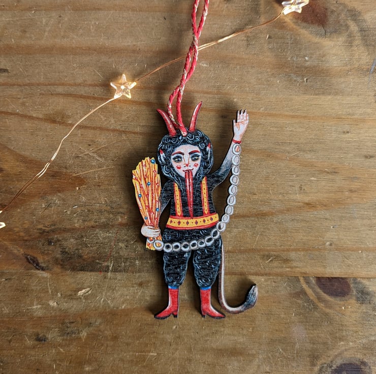 This Krampus design/ illustration is my own creation. It was originally a gouache painting of mine which I then meticulously converted into a decoration- so you won't find another one like it anywhere else!