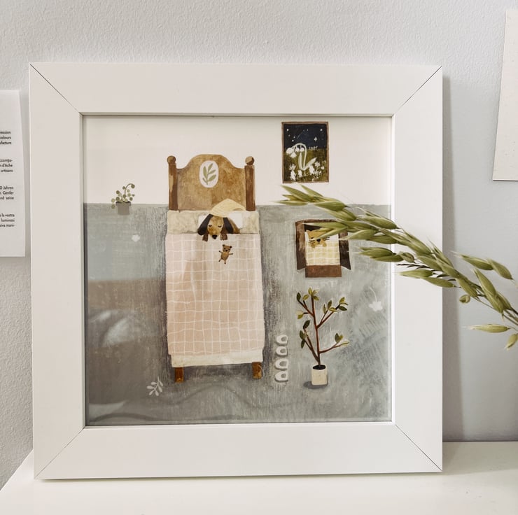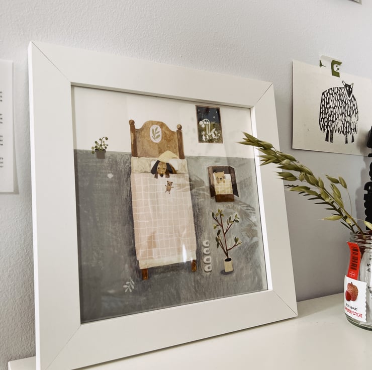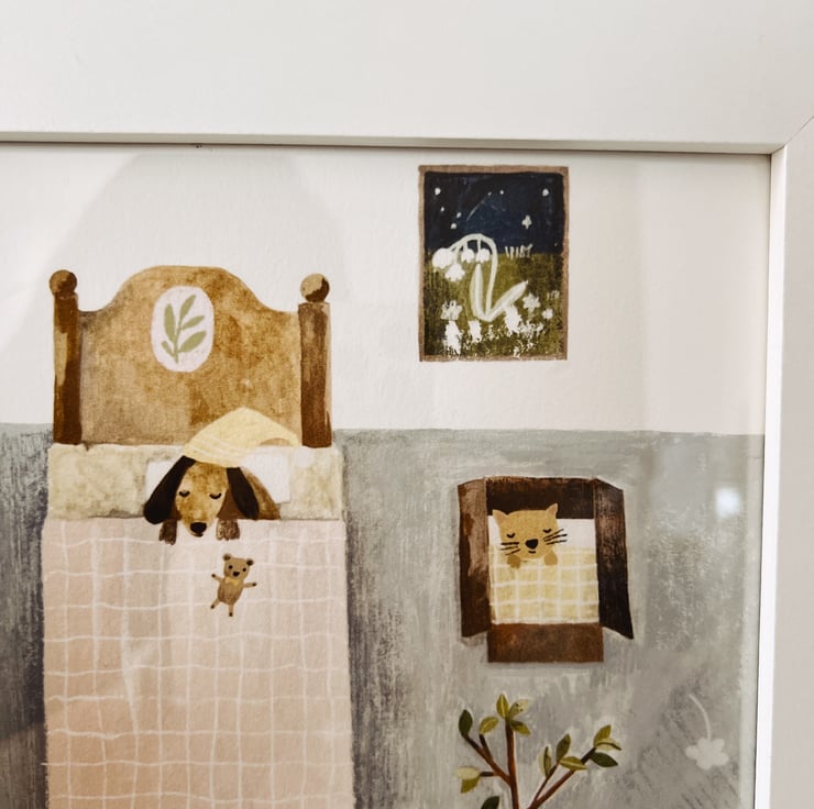 Bedtime with dog and cat! Original watercolour and gouache painting by After Providence. Framed in a white wooden frame.