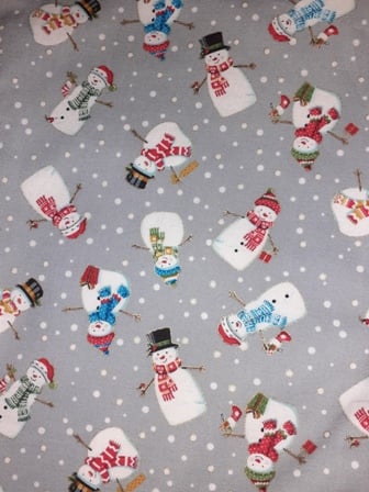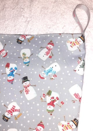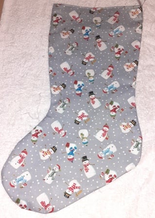 Colourful Snowmen in their bright Christmas scarves and hats tossed on a grey cotton fabric Christmas stocking. top to bottom 44 cms, across top front to back 23 cms.